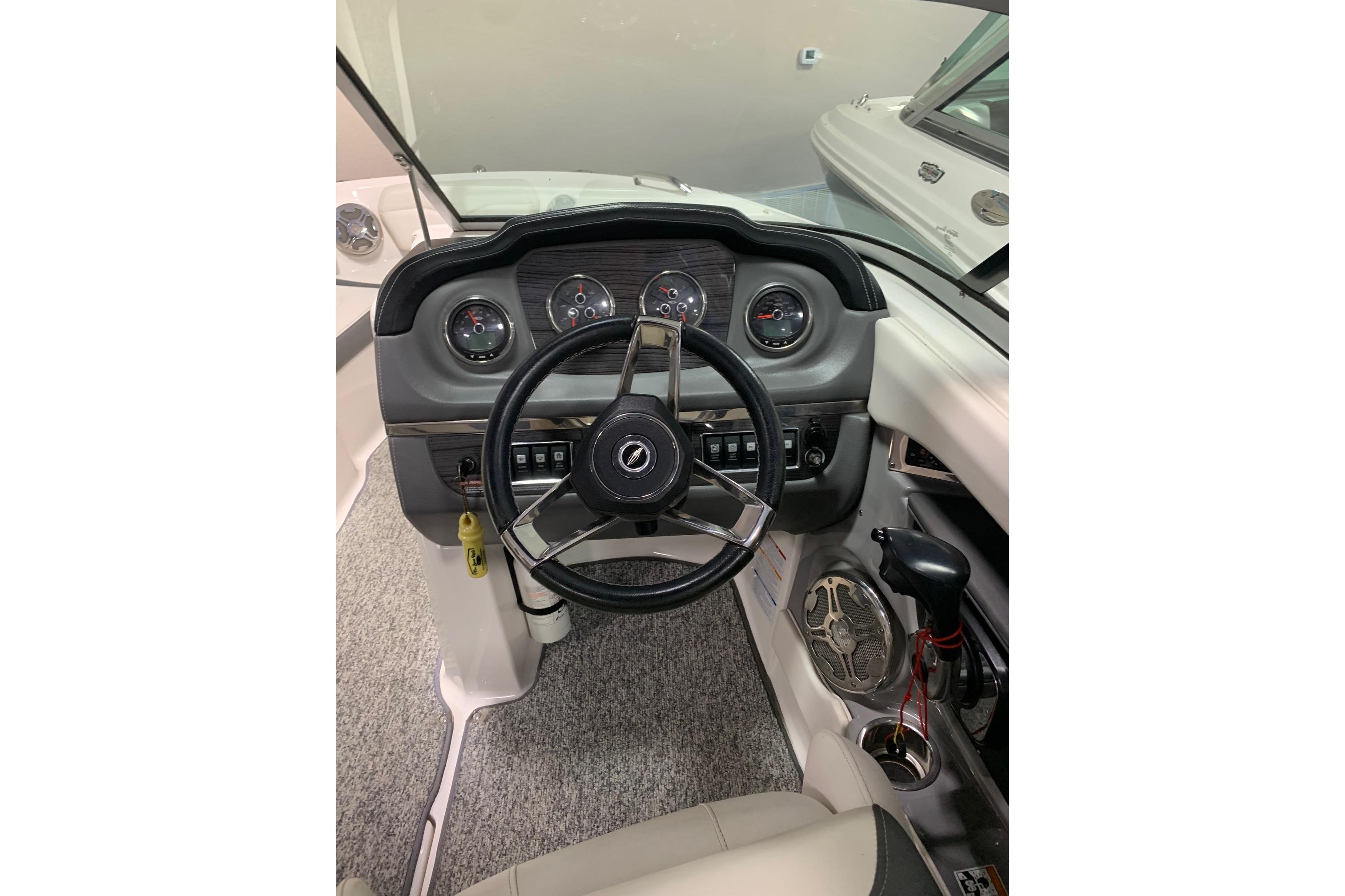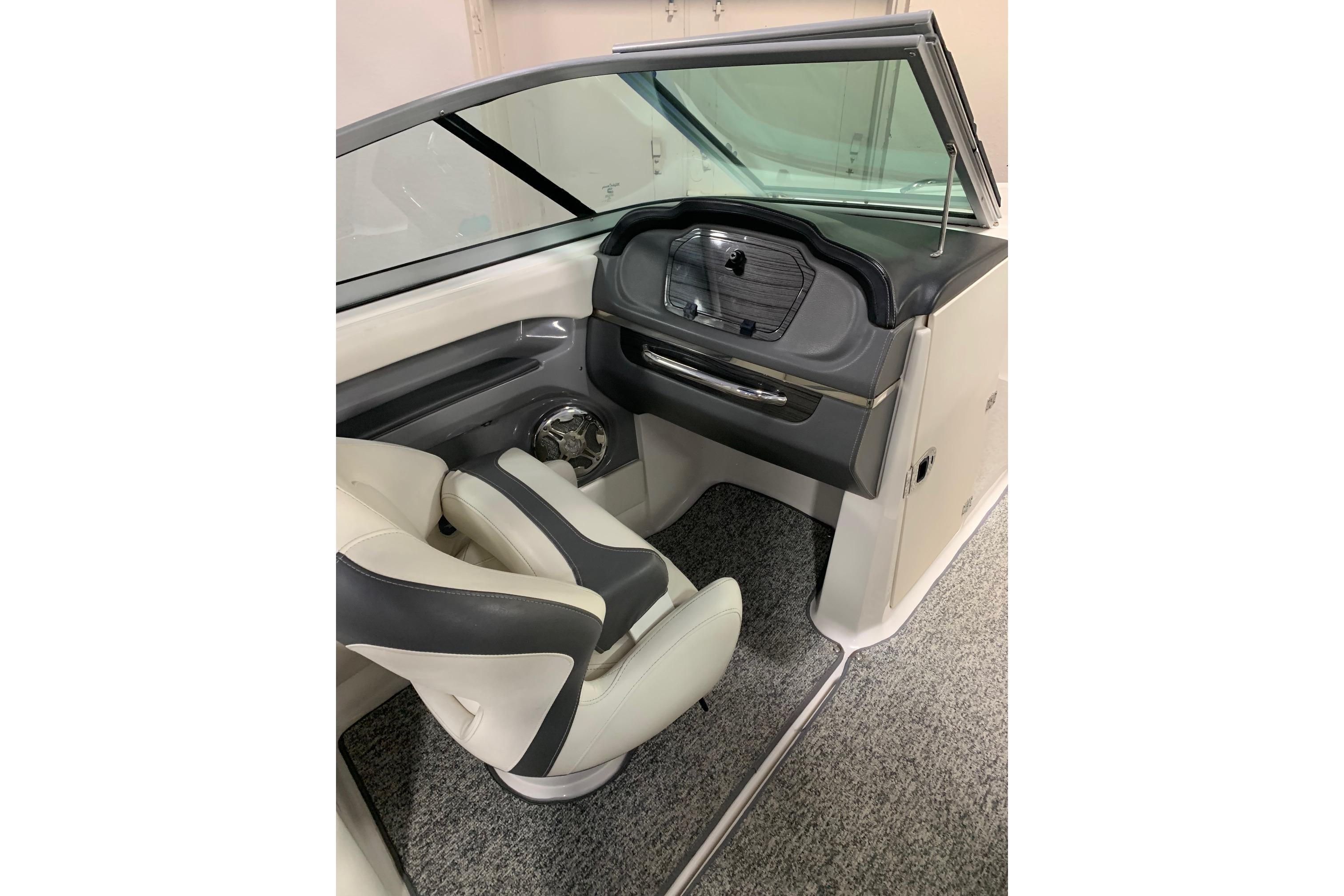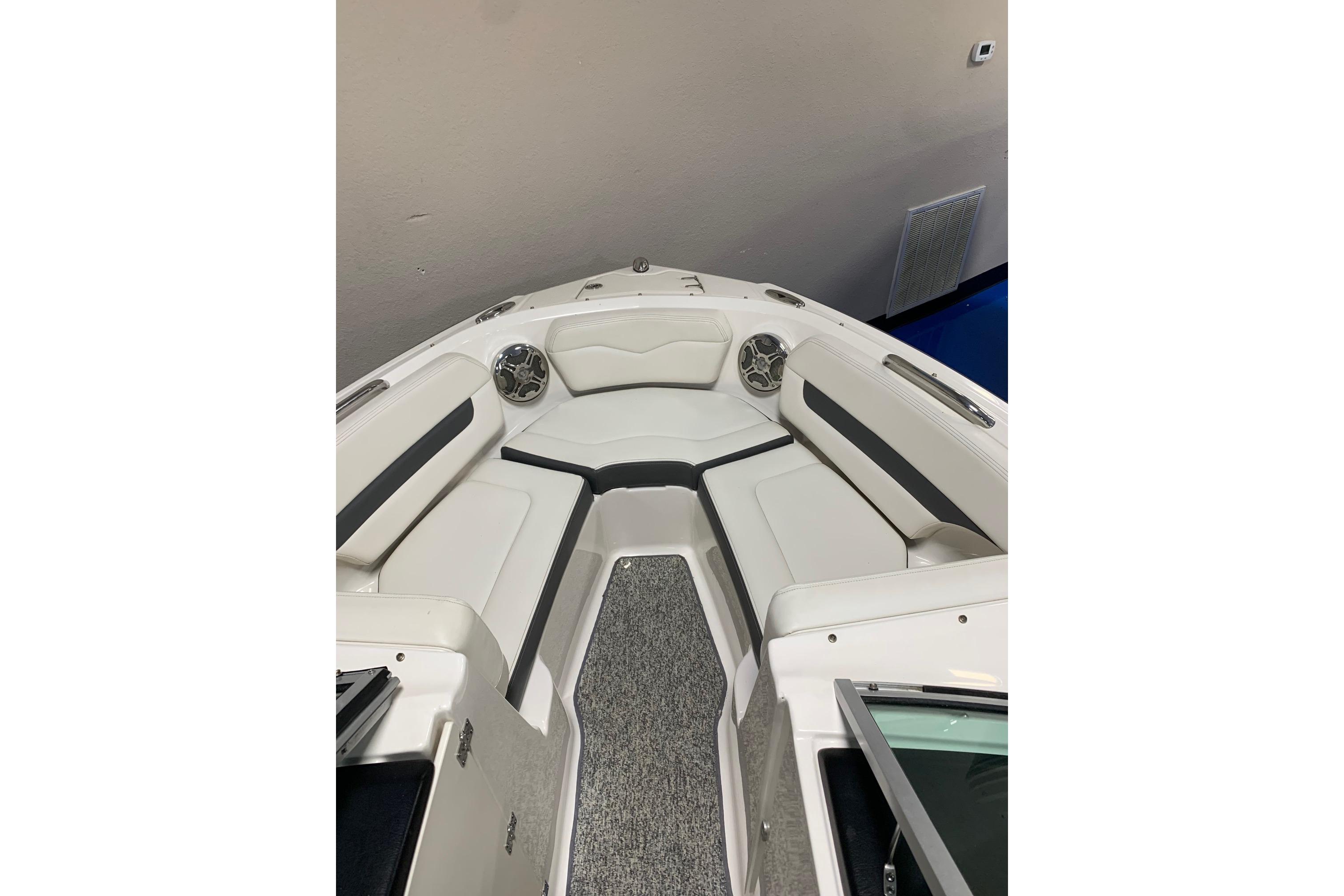 - Cockpit Layout - Two Bucket Seats with Logo Badging, L-Shaped Rear Bench Seat, and Aft Sundeck with Three-Way Hinged Cushions for Walk-Thru