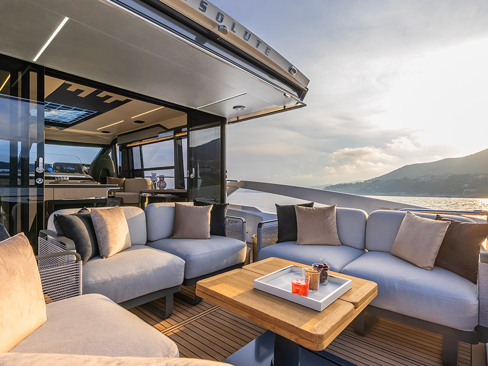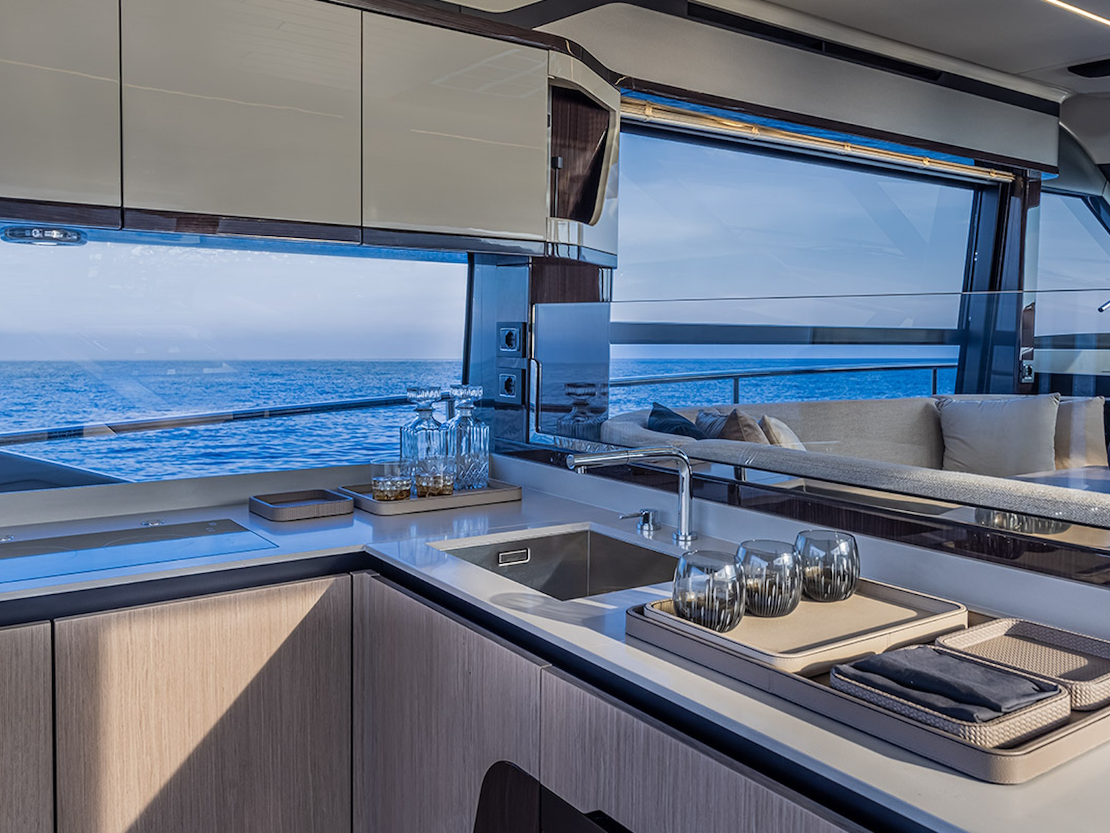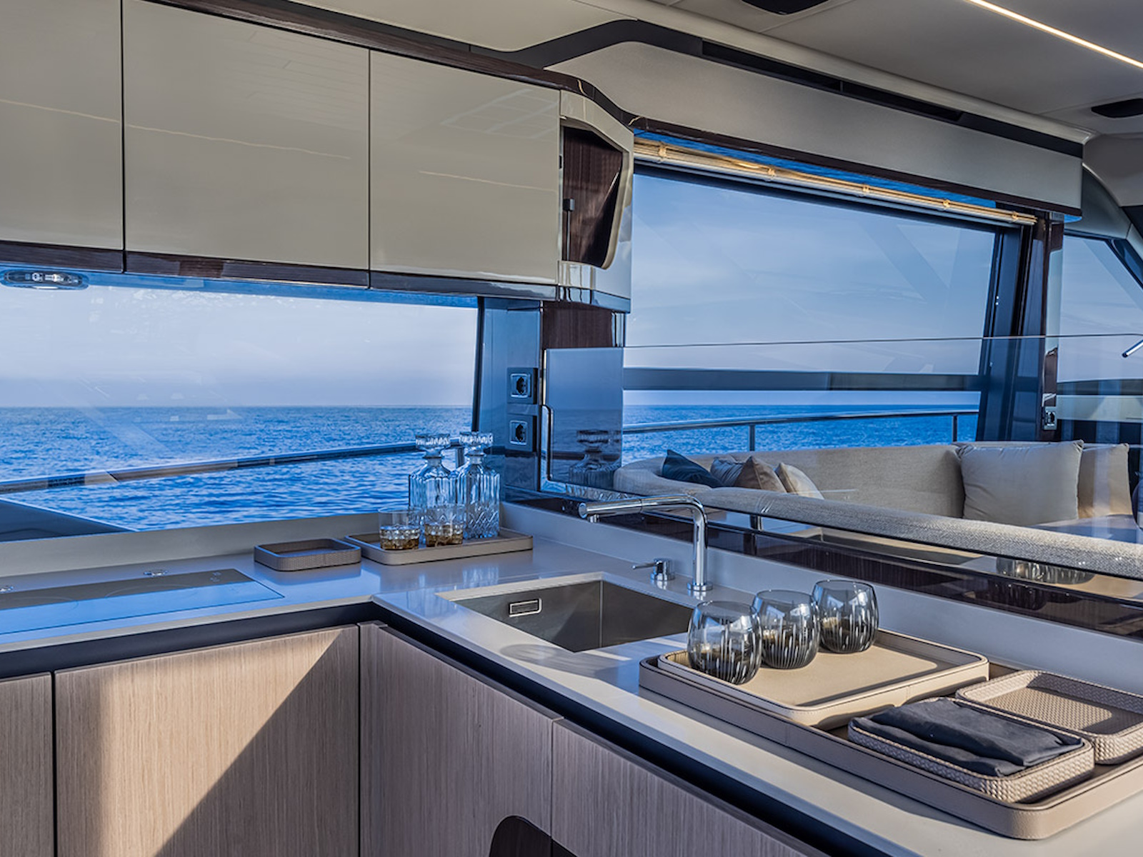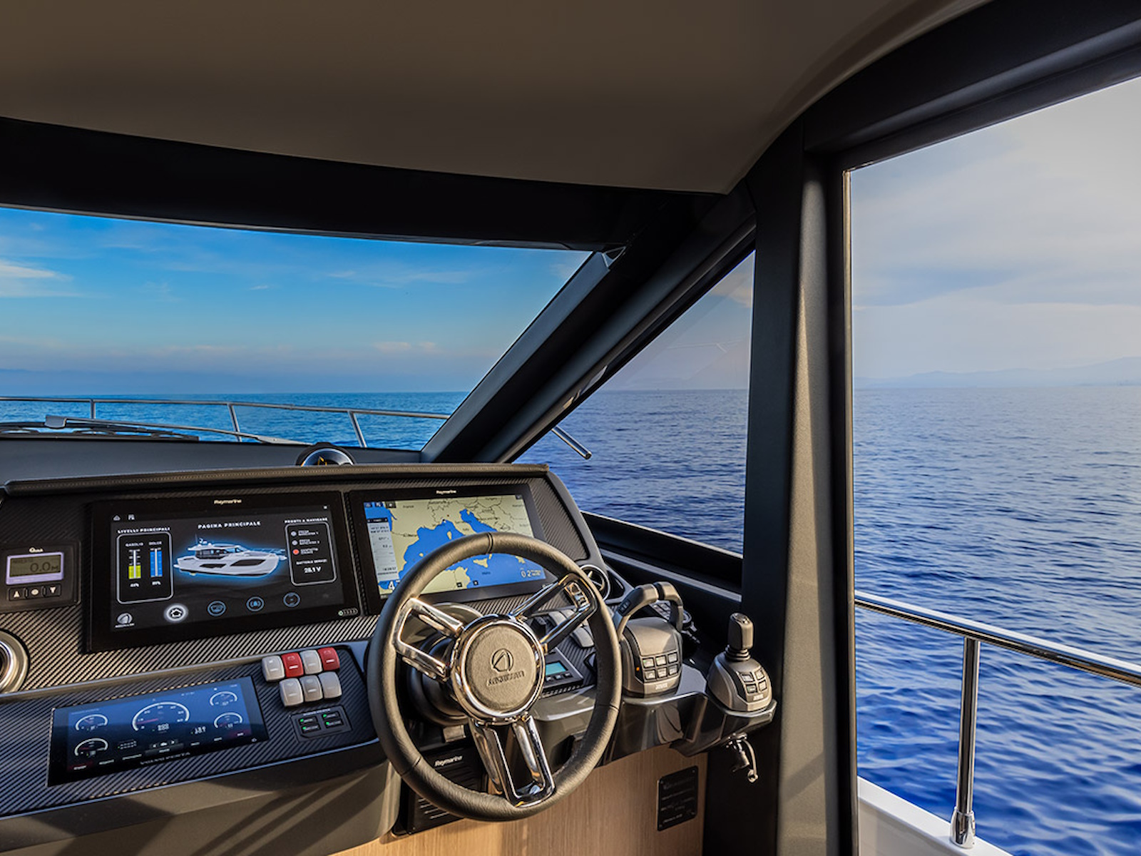In the salon, the large side windows envelop the entire deck and, together with the panoramic windshield, offer uninterrupted visibility. From the inside, the breath-taking view turns into an actual 360-degree panorama. Moreover, the windows can be electrically opened, letting in the sea breeze and creating a pleasant, natural air recirculation.