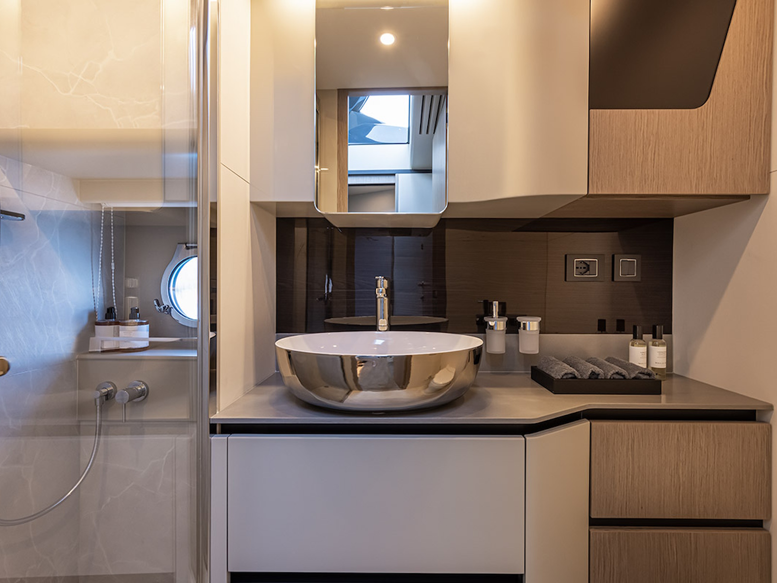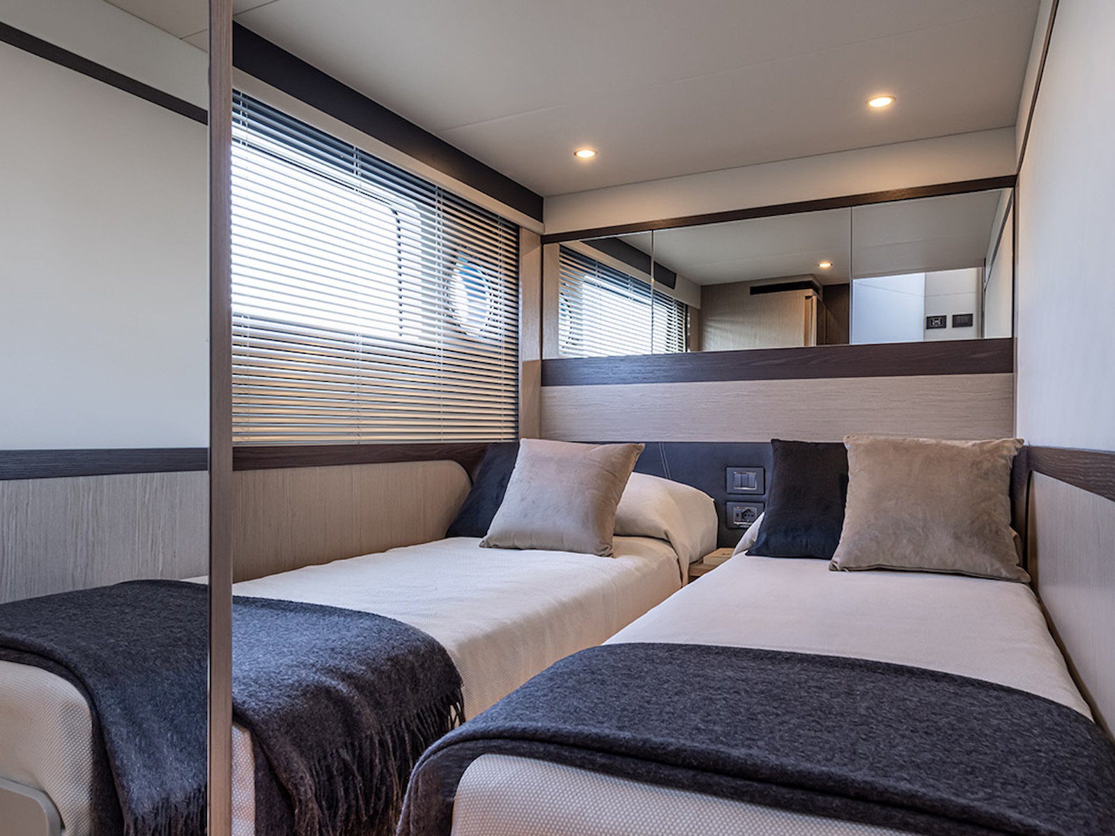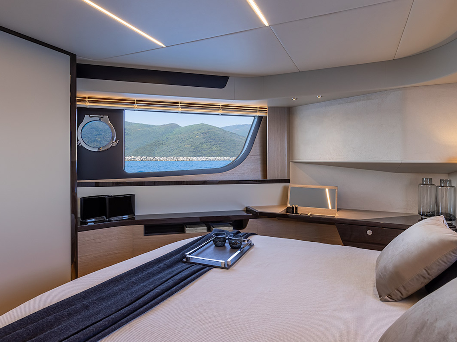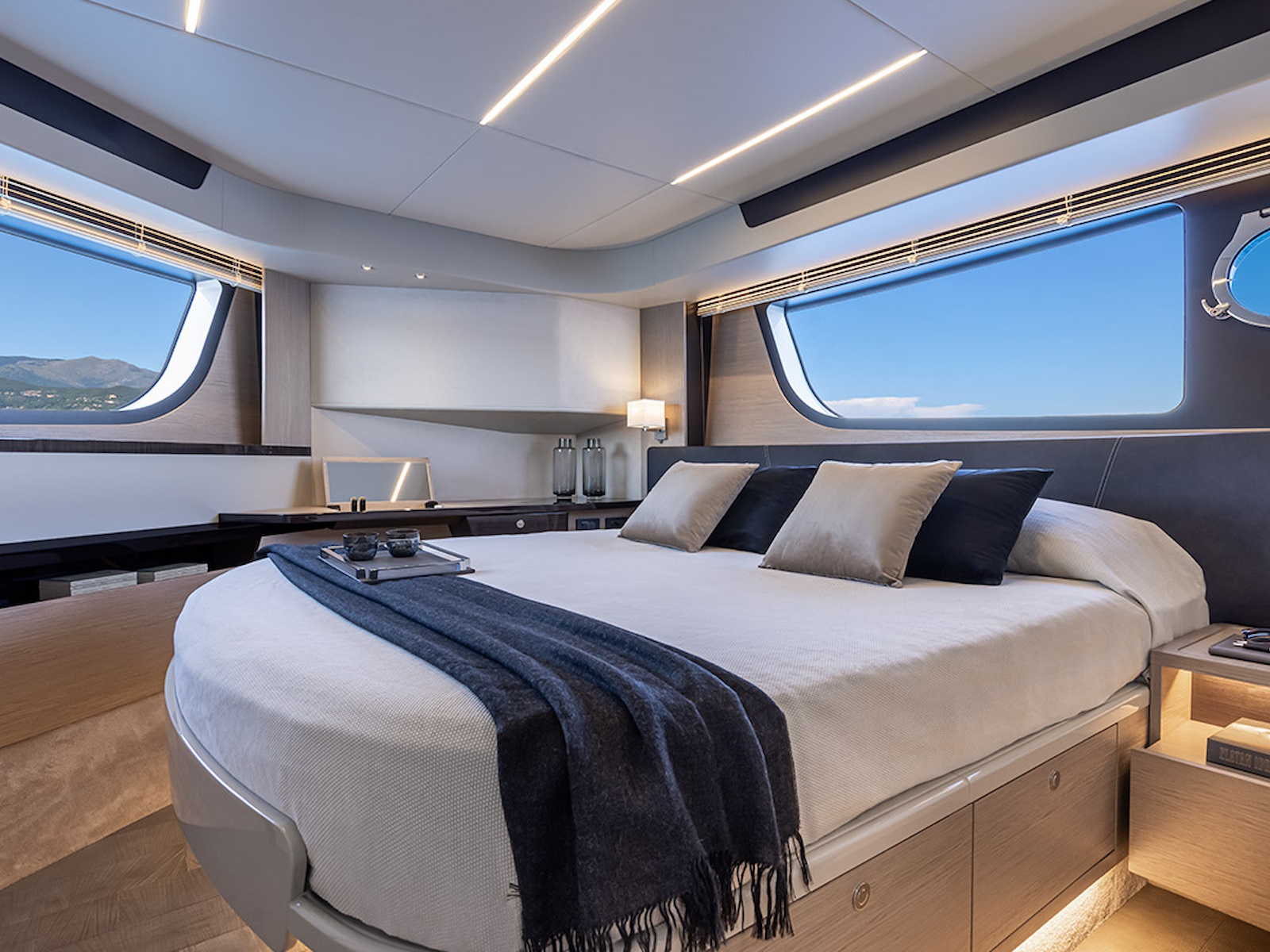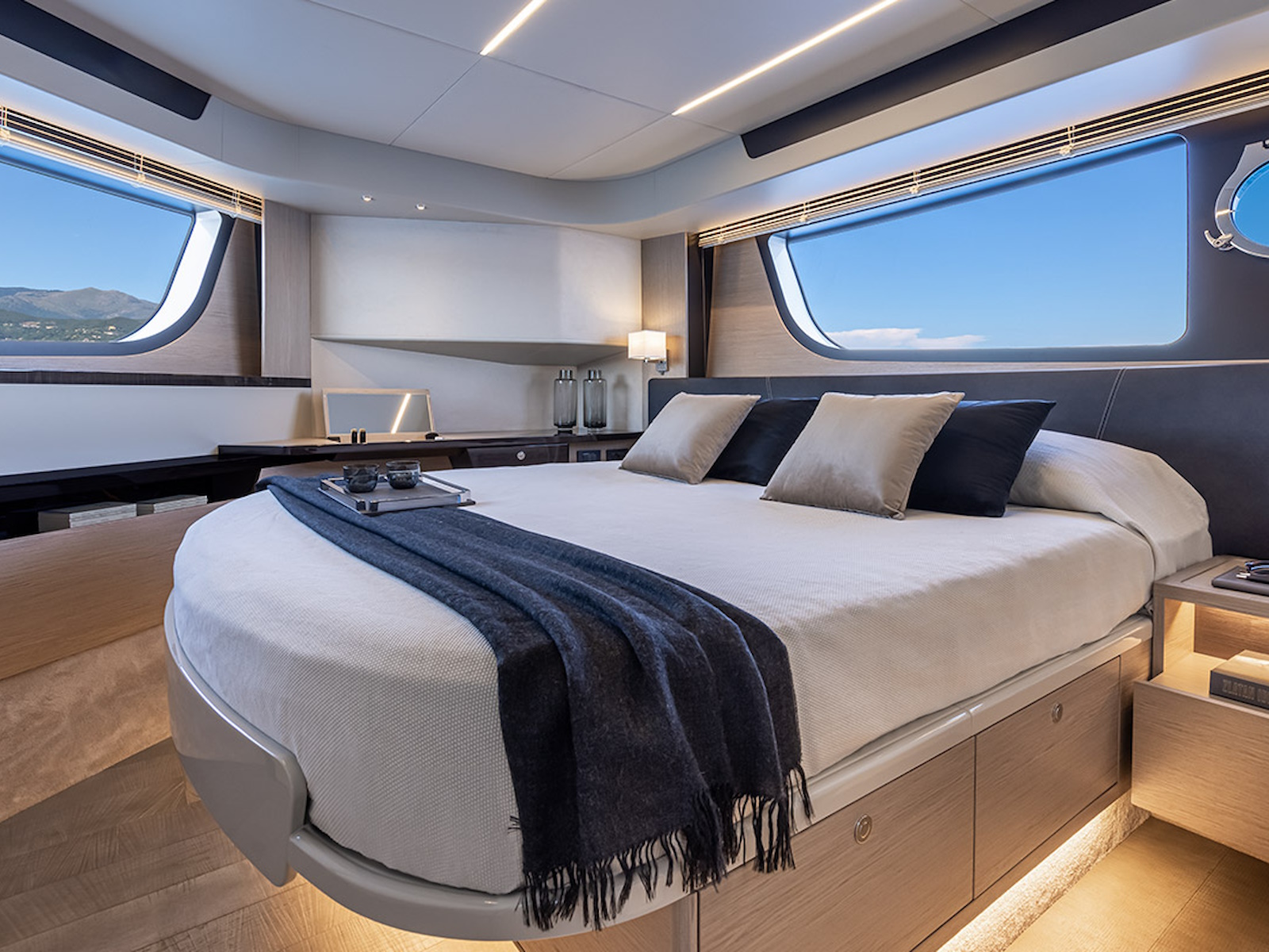 In the salon, the large side windows envelop the entire deck and, together with the panoramic windshield, offer uninterrupted visibility. From the inside, the breath-taking view turns into an actual 360-degree panorama. Moreover, the windows can be electrically opened, letting in the sea breeze and creating a pleasant, natural air recirculation.