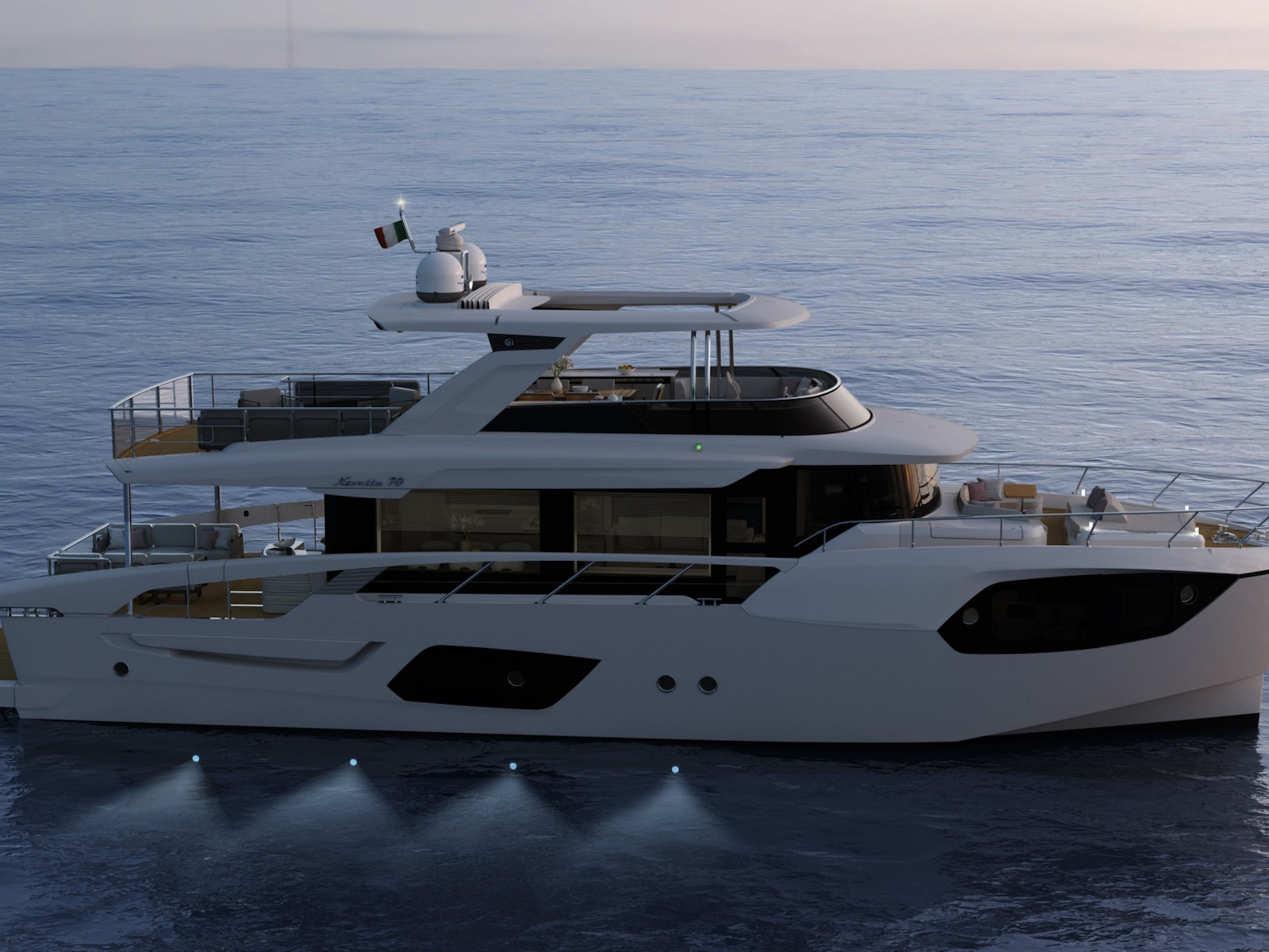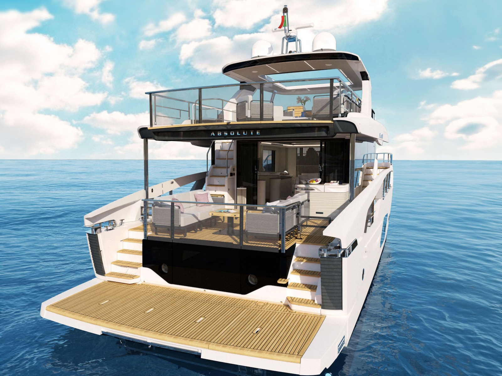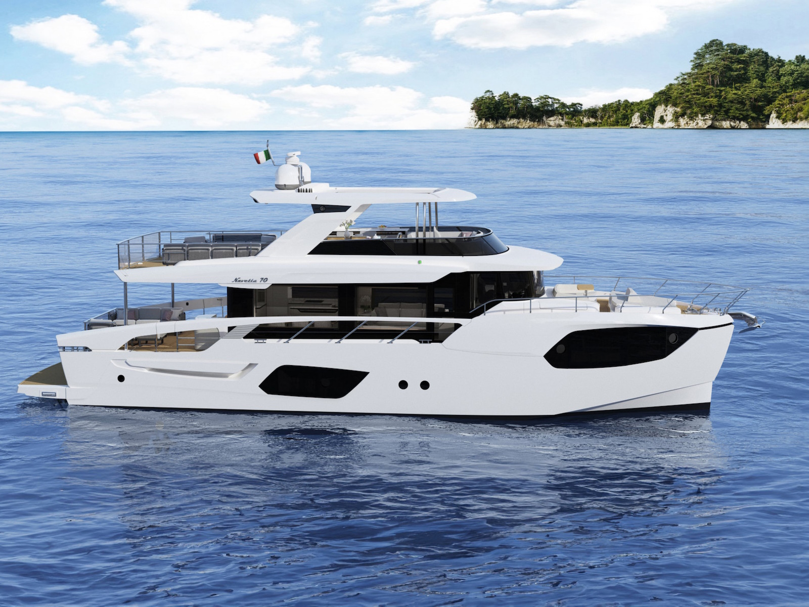 The new Navetta 70 introduces innovative design elements, elegant and on-trend, without forgoing some distinctive features of the Absolute brand, such as the iconic side glass railings.