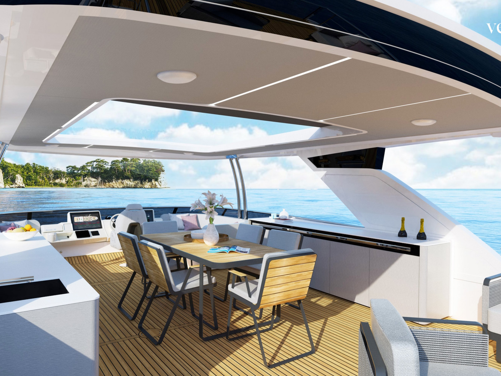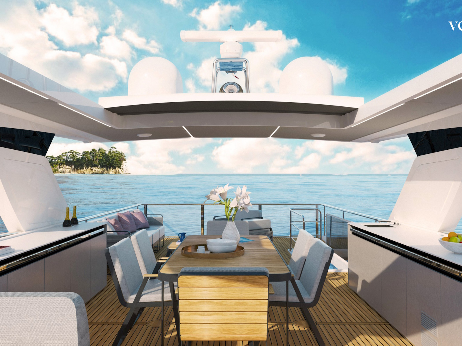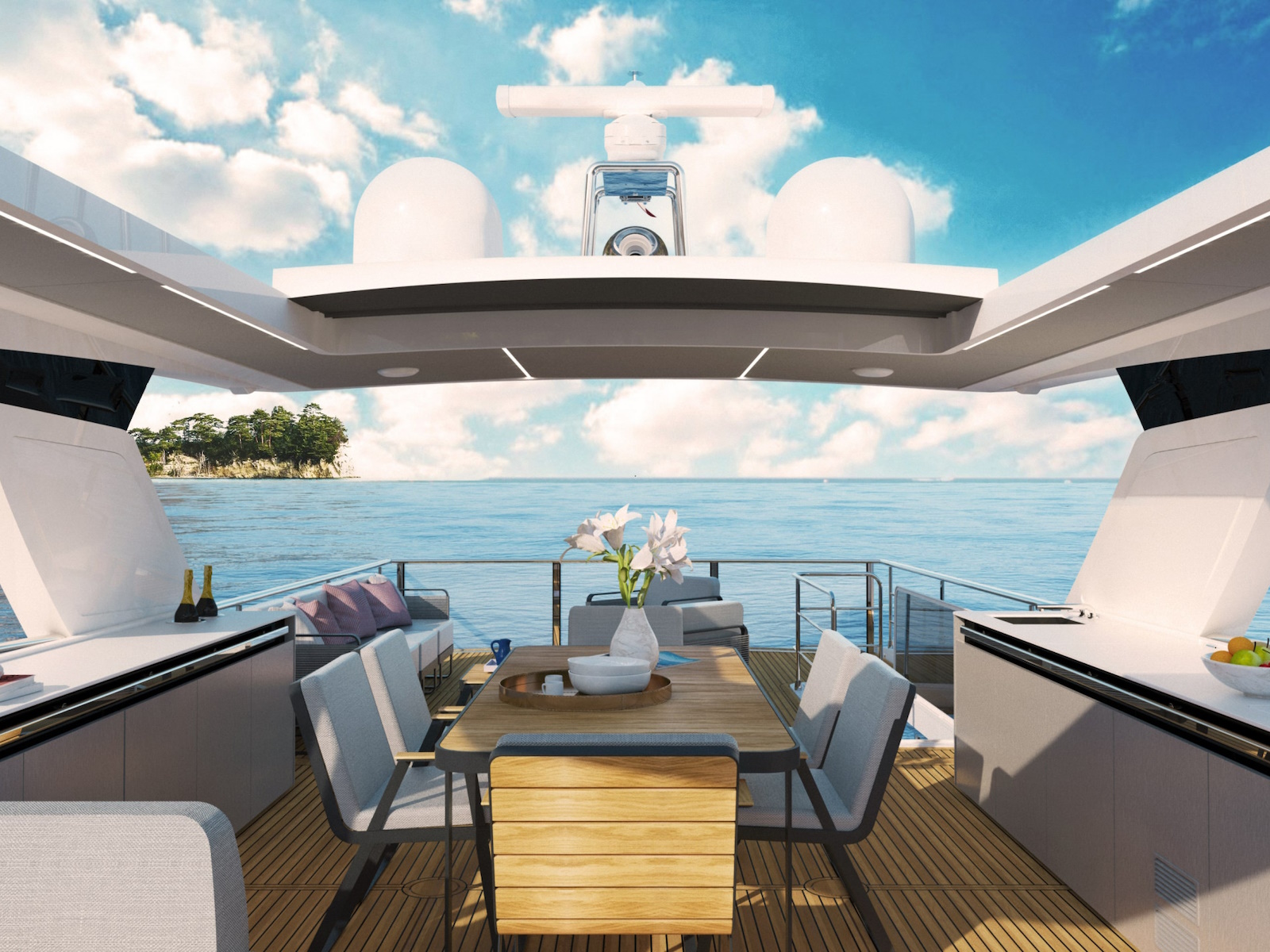This yacht has also been designed to enjoy a 360-degree view of the sea on board, with the perception of being on a vessel with much larger volumes. The spacious kitchen and the ample lounge further contribute to the impression of even more generous spaces.