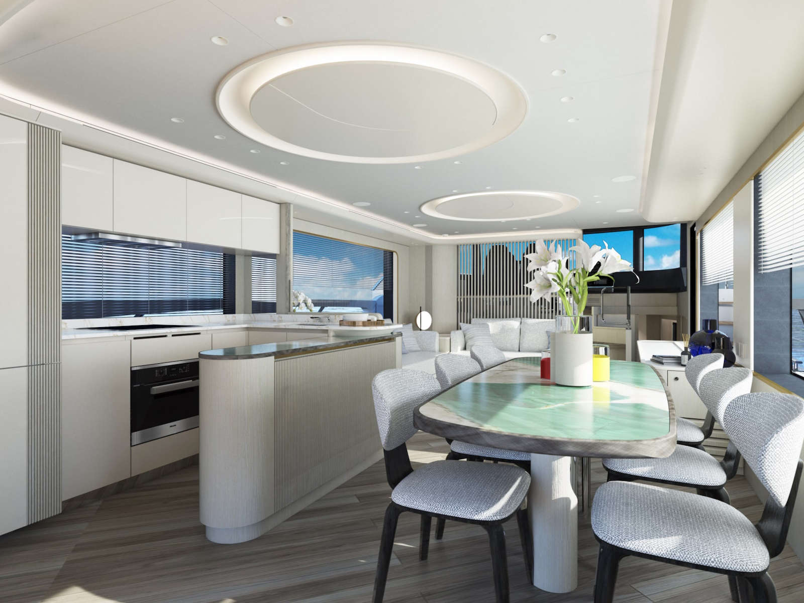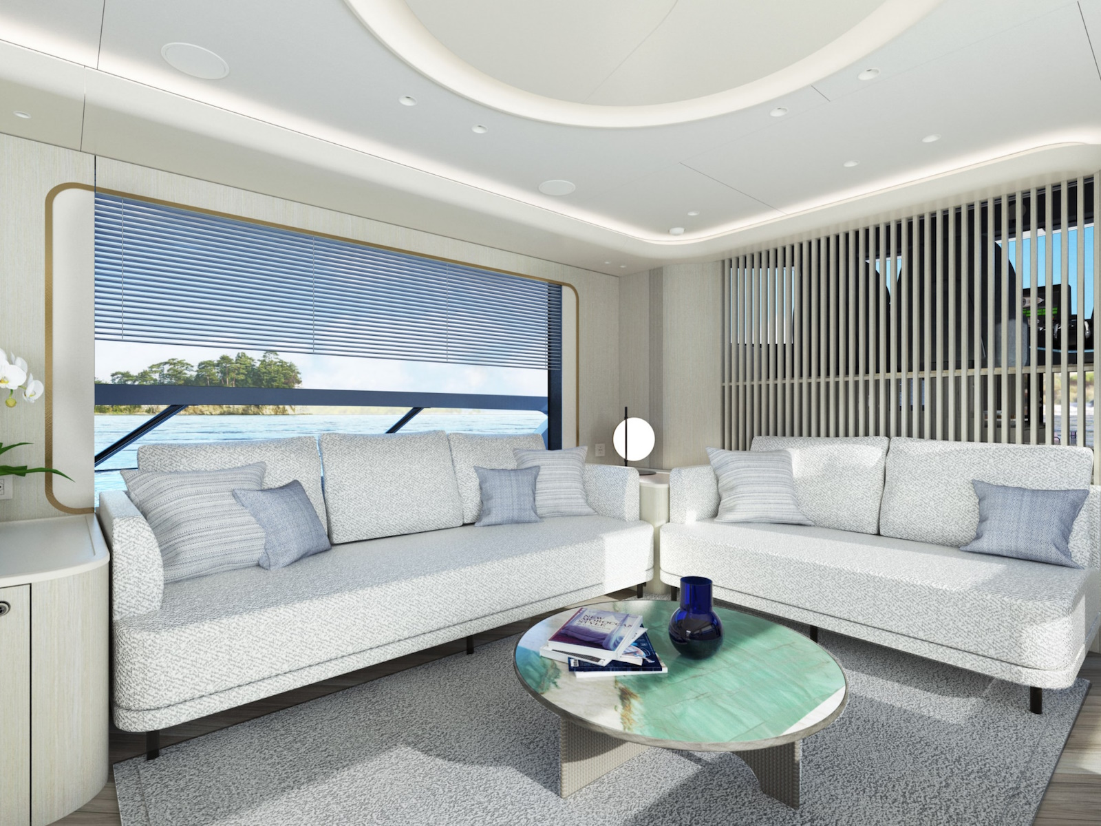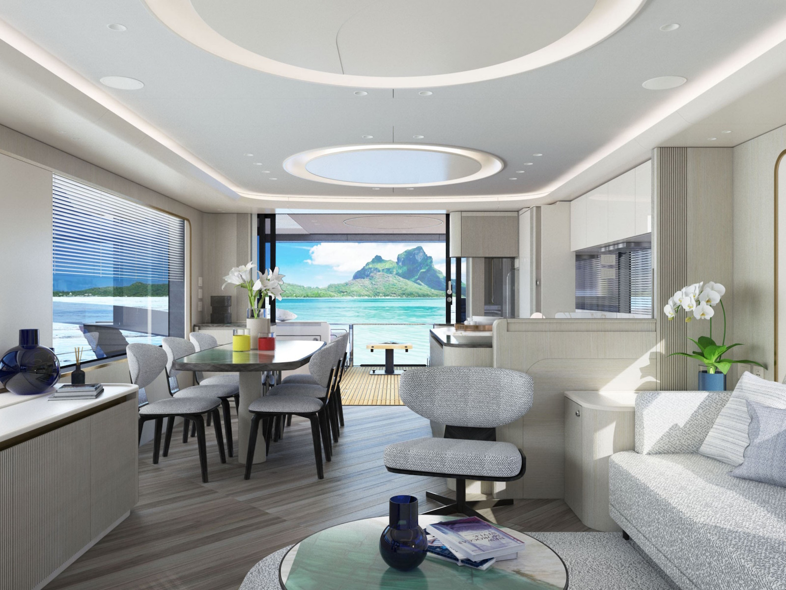 The sinuous profiles of the furniture and the circular motif used for lighting contribute to a sense of harmony and continuity. The constant visual connection with the external marine environment is ensured by the expansive windows.