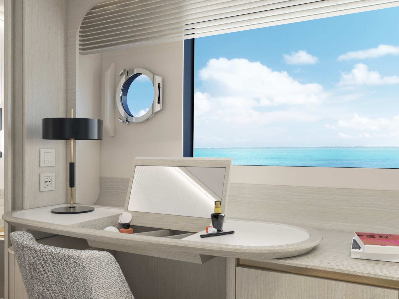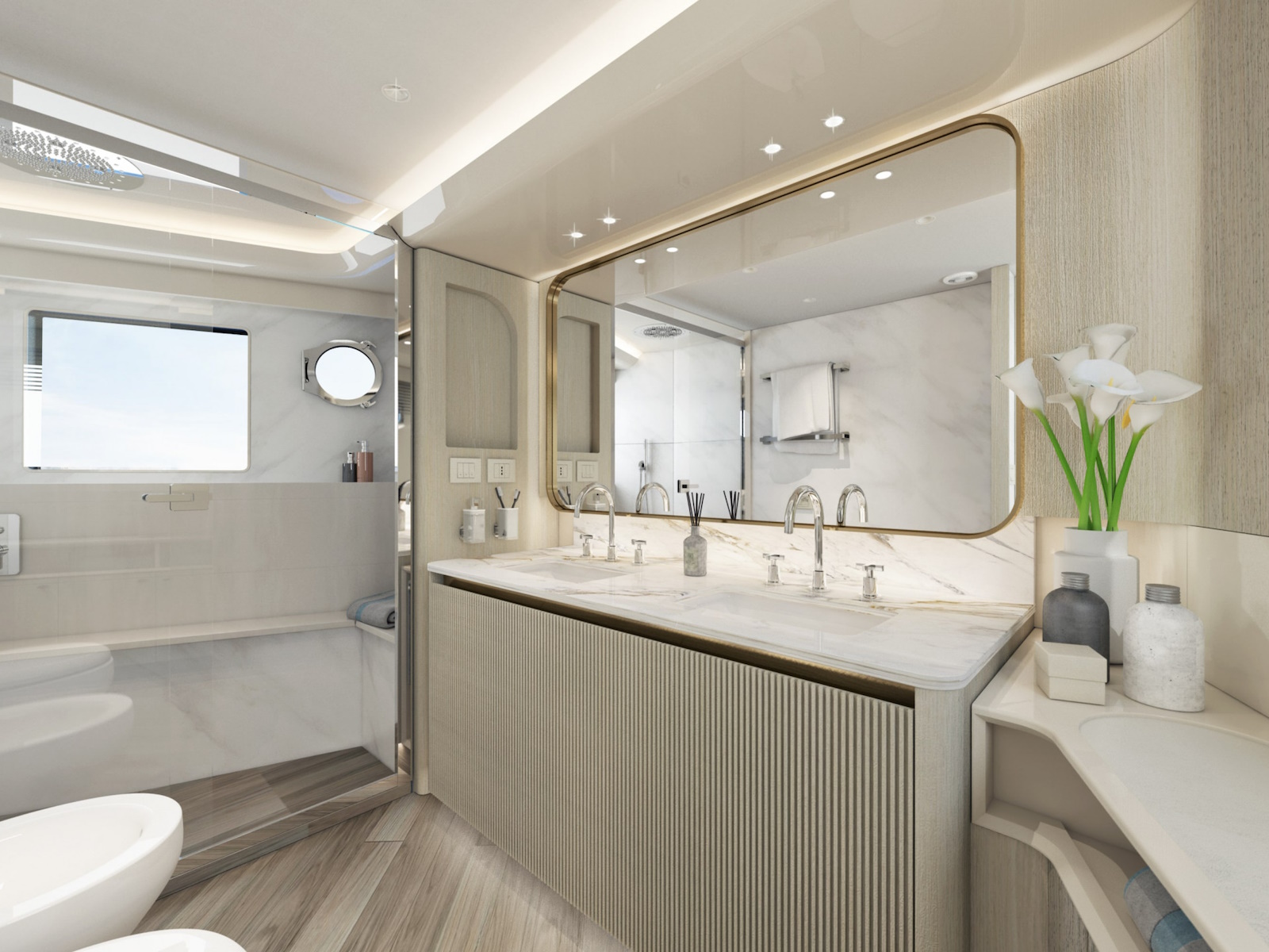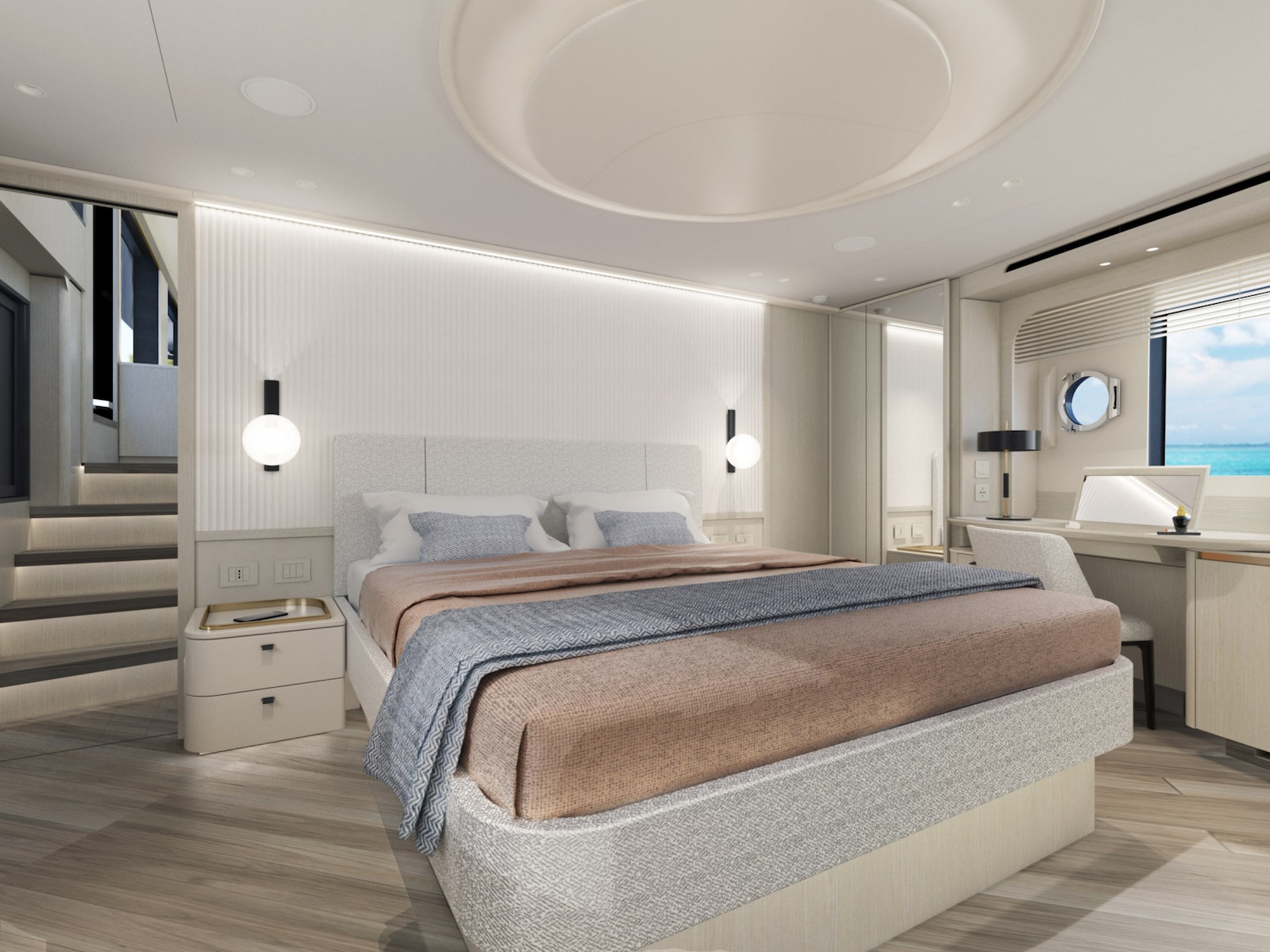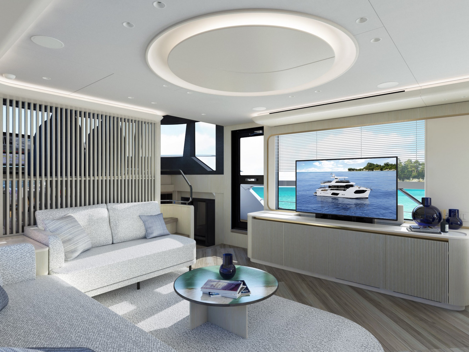 The sinuous profiles of the furniture and the circular motif used for lighting contribute to a sense of harmony and continuity. The constant visual connection with the external marine environment is ensured by the expansive windows.