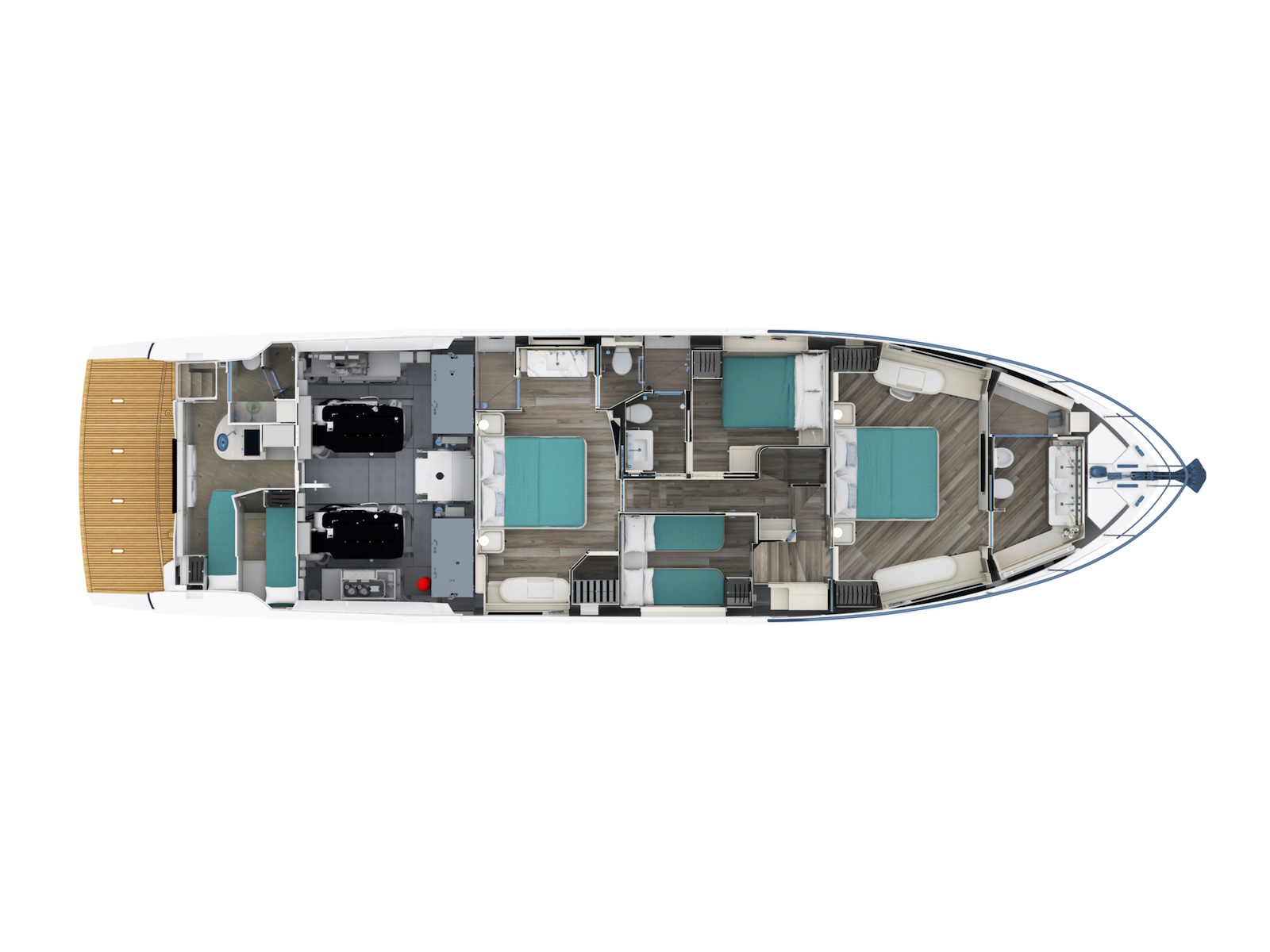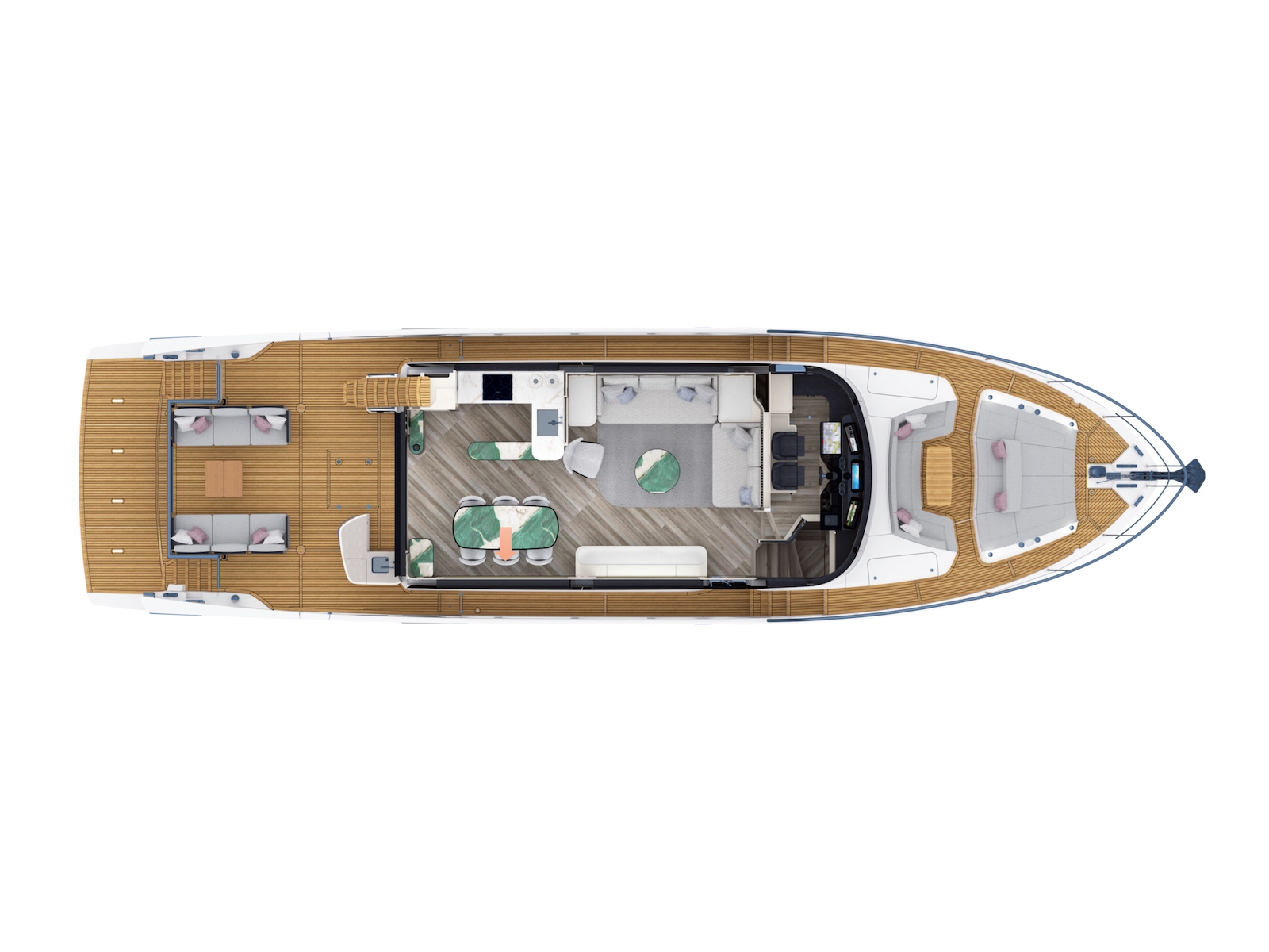 The exterior spaces of this yacht are distinguished by dynamic and captivating lines, featuring a spacious and redesigned flybridge and a comfortable terrace cockpit.