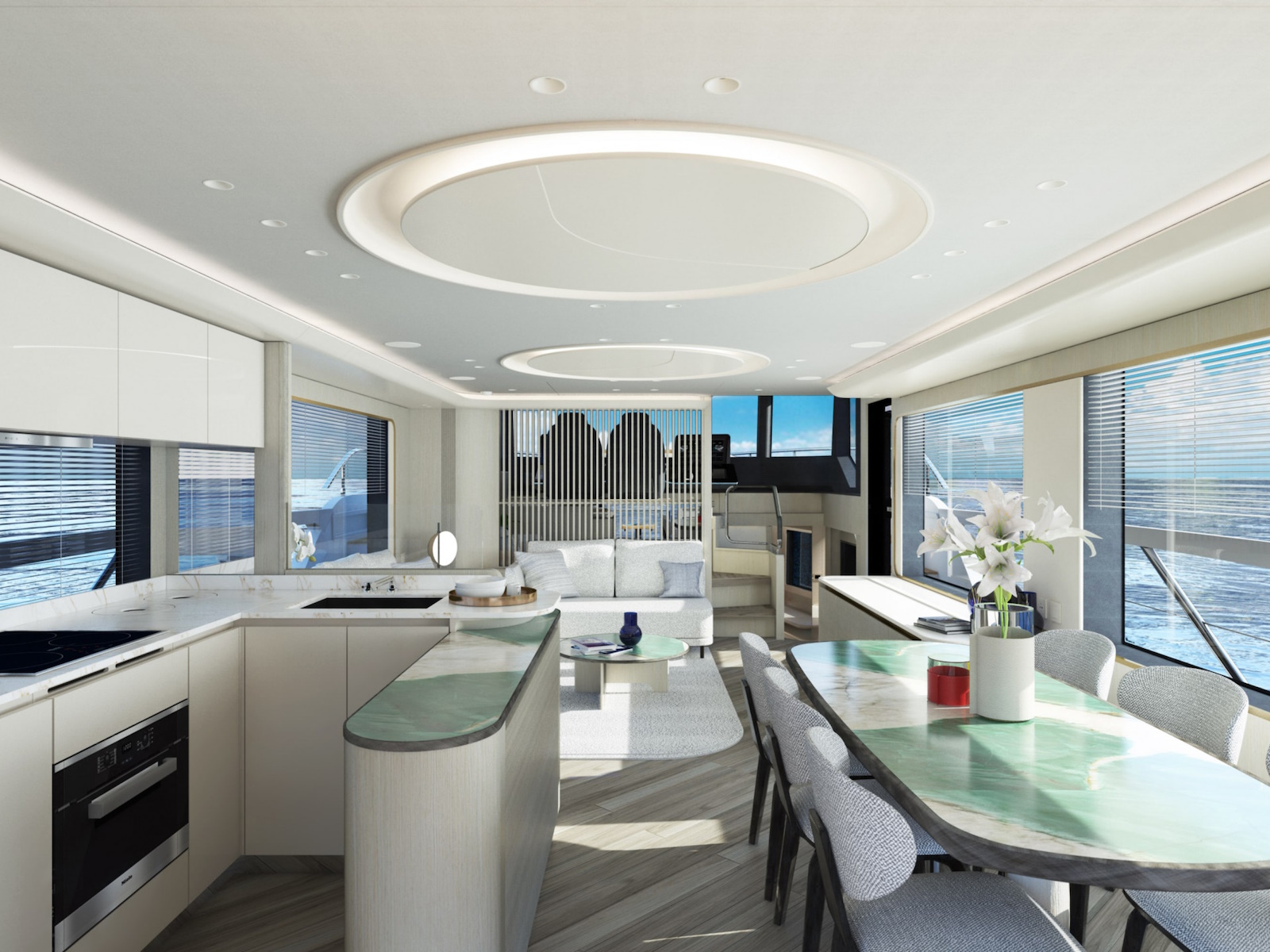 The sinuous profiles of the furniture and the circular motif used for lighting contribute to a sense of harmony and continuity. The constant visual connection with the external marine environment is ensured by the expansive windows.