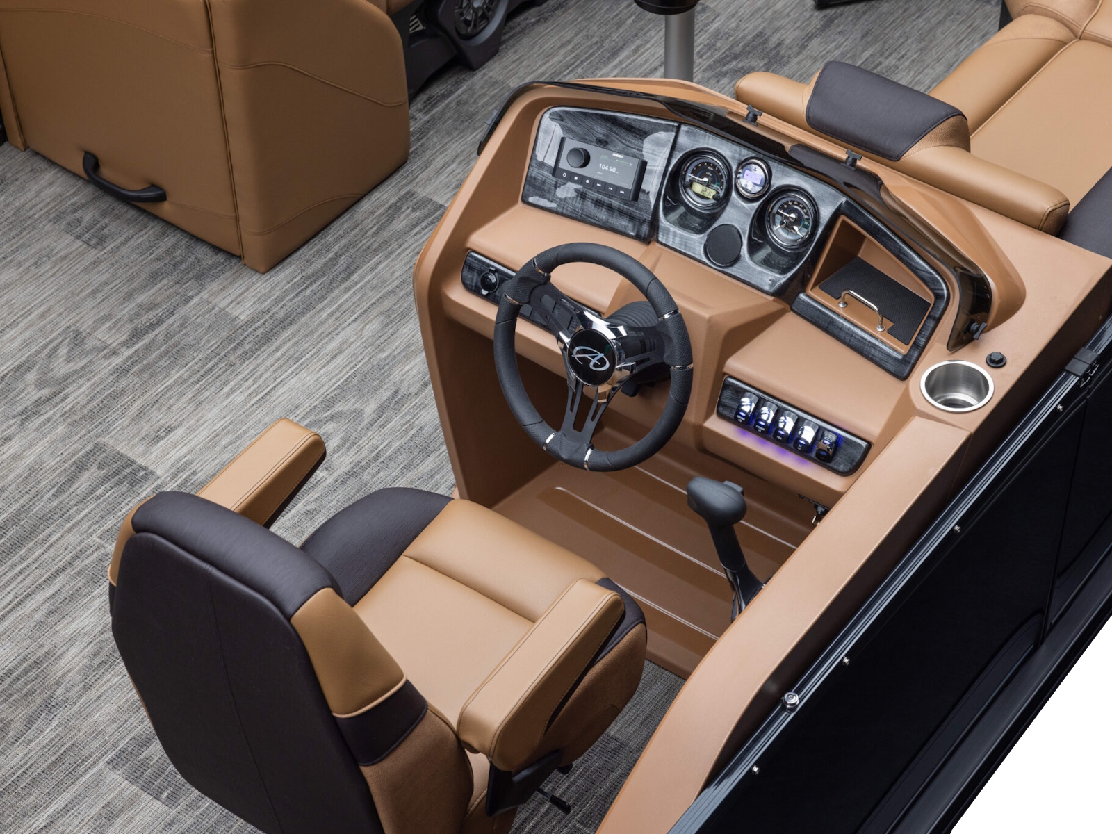 - Rear fishing center with 2 fishing chairs, rod holders & livewell