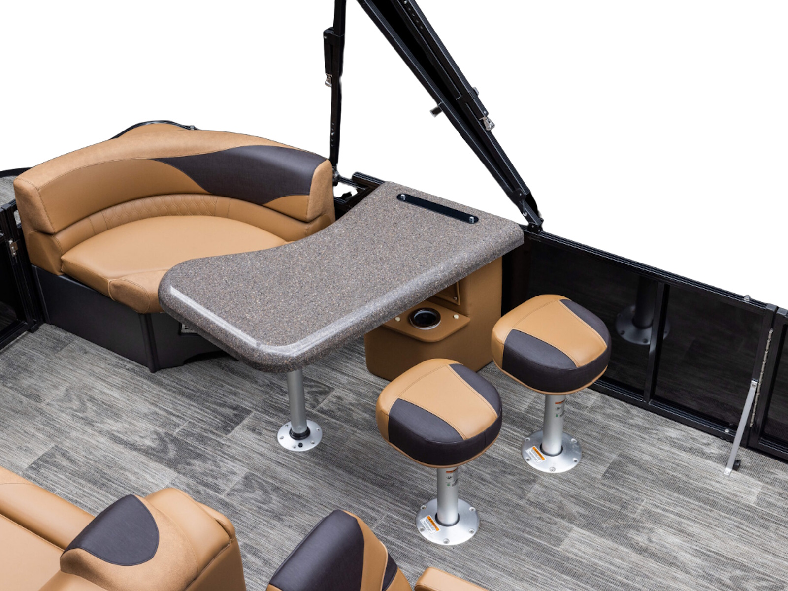 Crew rotocast helmstand with large dash & side storage | Lounge arms with storage (based on floorplans) | Greywood heavy duty thermoform table with large cup holders, recessed tray & phone storage (large kidney or rectangle)