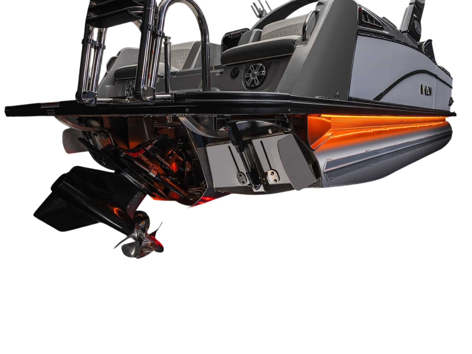 Premium sound package: Fusion RA-770 radio, (6) Fusion SG RGB-lighted speakers & grills, Fusion 6-channel amp, Fusion D mono block digital amp, 10” Fusion Subwoofer, USB audio input & charge