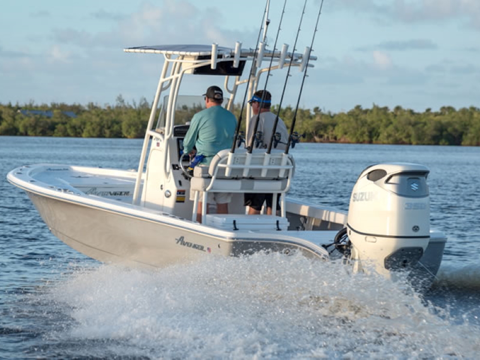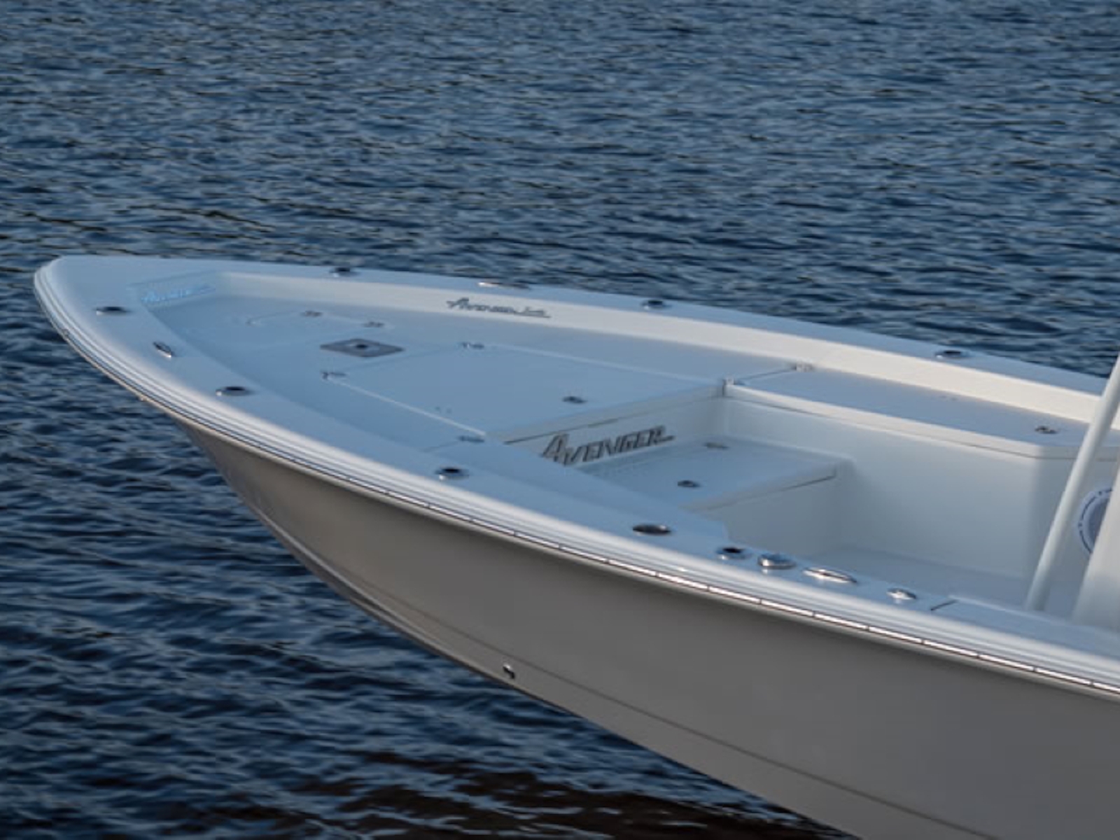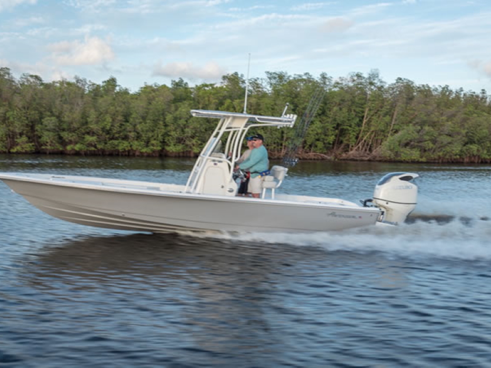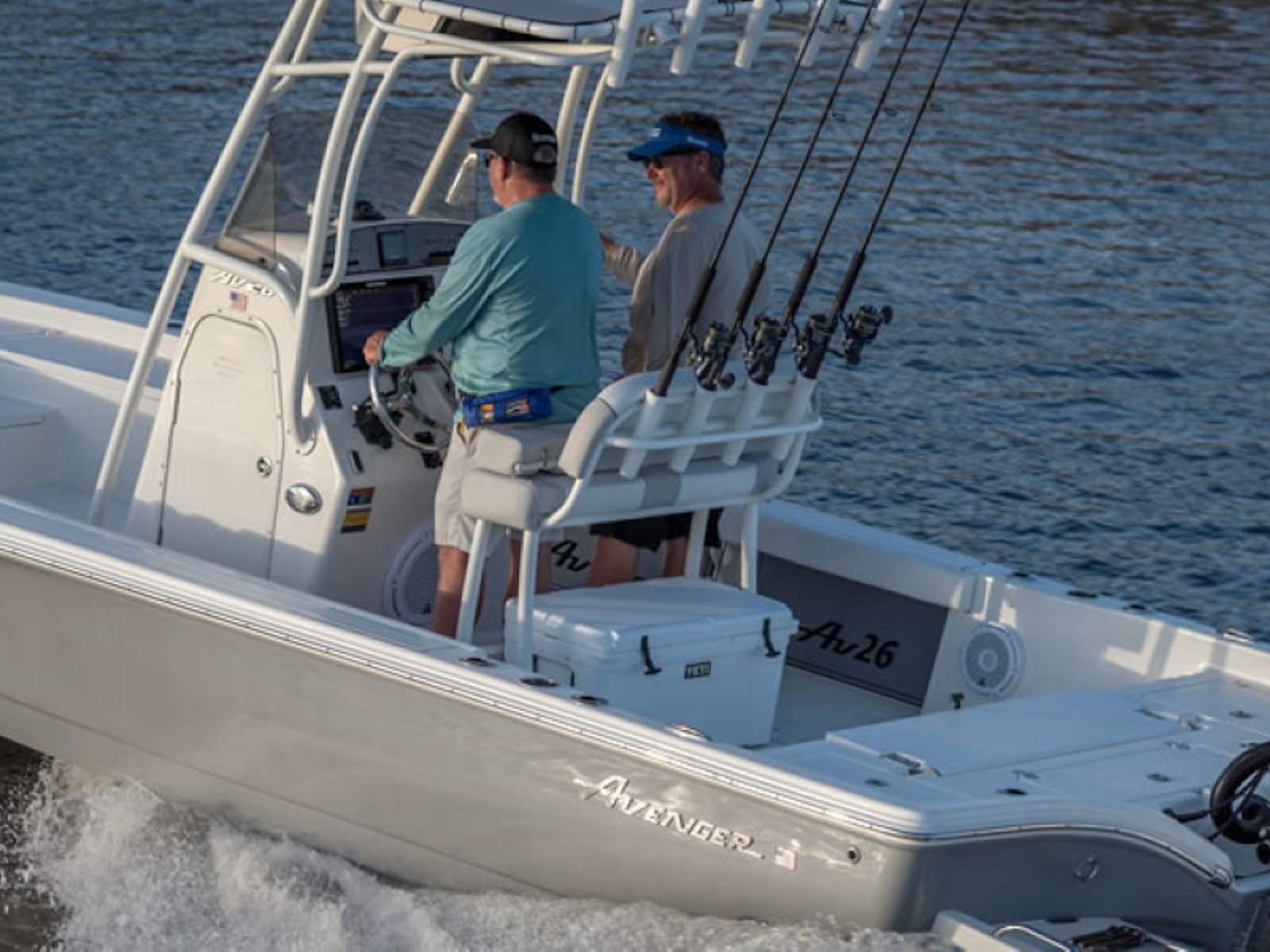 The Avenger AV-26 has an overall length of 26 feet 2 inches and a beam of 8 1/2 feet built with the serious fisherman in mind. This stable fishing platform is complimented with standard equipment like two live release and one bait well, dual lockable rod storage boxes, and an anchor locker built to accommodate both bow and stern anchors. The Avenger AV-26 is rated for a single engine of up to 400 HP and features an 89 gallon capacity fuel load, making your favorite fishing spot easily and quickly accessible