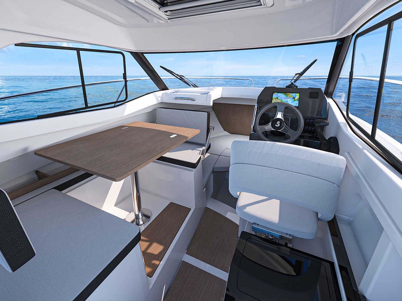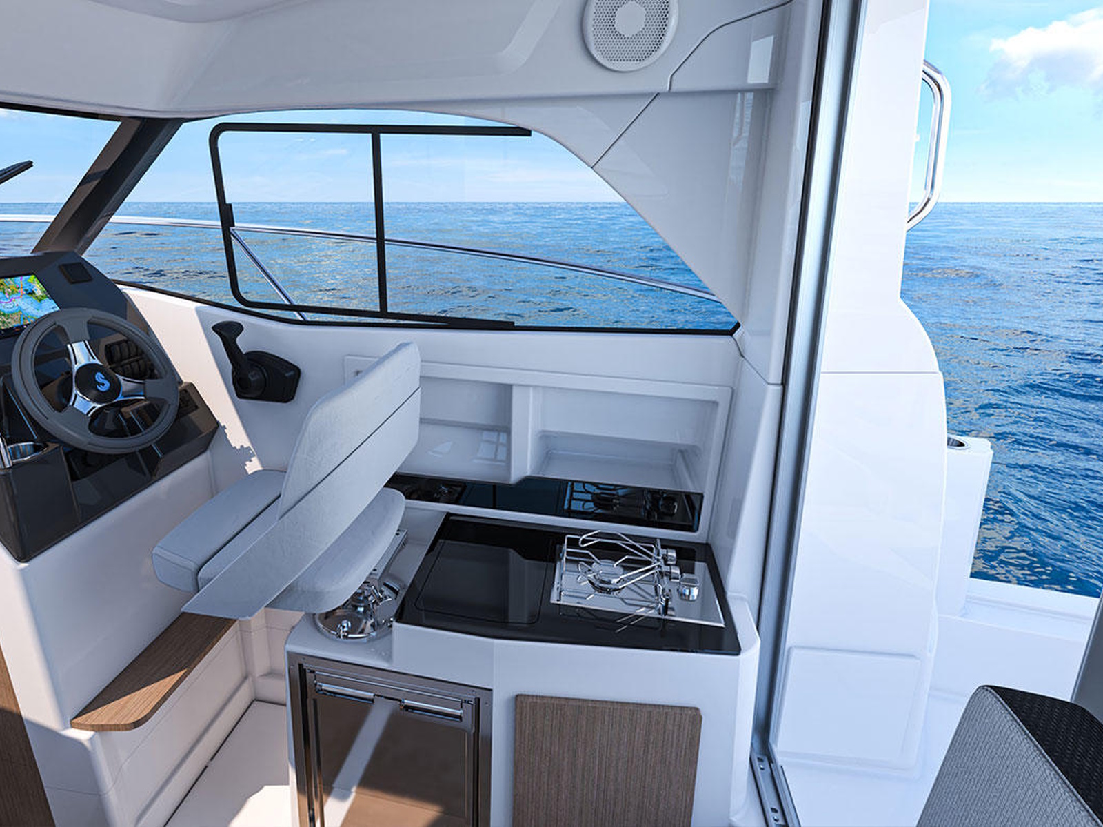 The Antares 7 saloon offers outstanding comfort. Modularity is enhanced by a swivelling pilot's seat, and a co-pilot benchseat that tilts in an instant to face the second benchseat, or to create a berth. The galley area is located behind the pilot's seat.