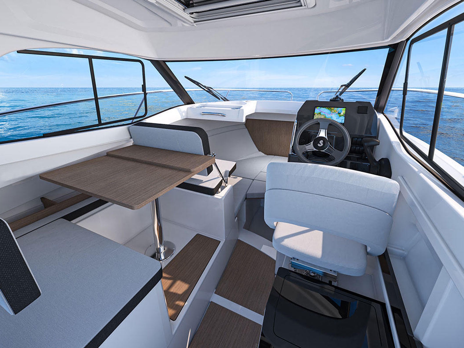 The care taken in designing the Antares 7 silhouette follows into the saloon, which has a particularly attractive helm station. Fitted with an all-black dashboard in a single piece, it elegantly compliments the boat's overall finish. The many glazed windows and ventilation openings offer all passengers superb panoramic views and excellent aeration. The cabin's numerous storage spaces and modularity make for a very comfortable life on board.