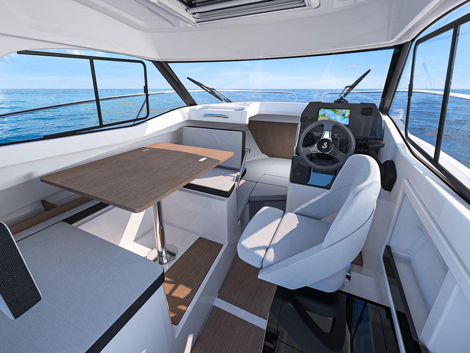 The cockpit can comfortably seat up to 5 people. All the seats, and the large folding table, can be converted into a spacious sunpad.