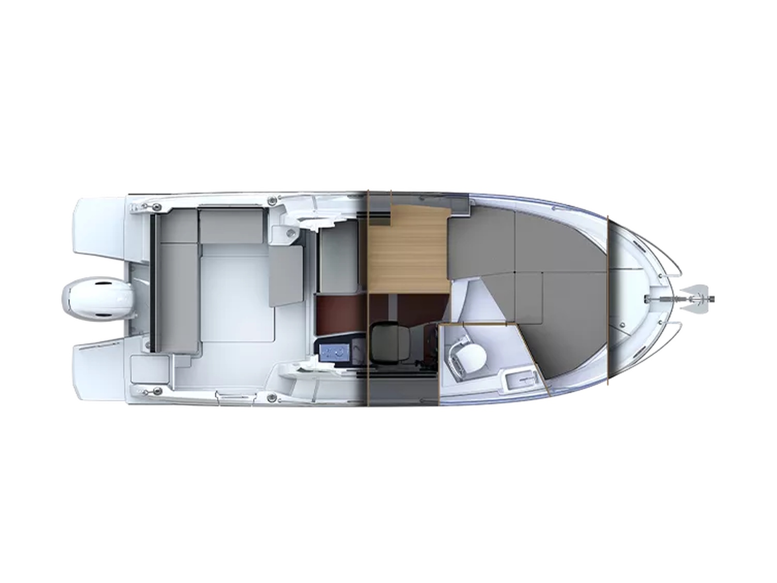In the Fishing version, the aft benchseat is replaced by a fishing station equipped with rod-holders, cup-holders, cutting board and storage space for lures and hooks.