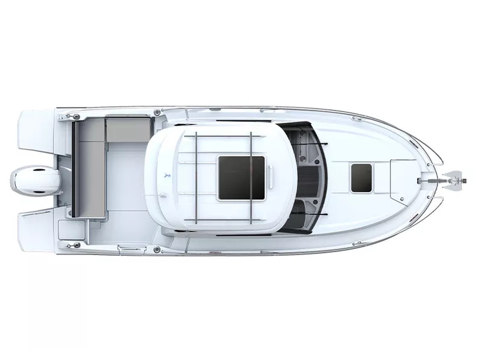 Its taut, clean lines confer a sporty allure, like the rubbing strake that gives the boat its lean, elegant silhouette. This new unit asserts its own character while retaining the characteristic features of the Antares range. Its cockpit, slightly offset to port, offers a wide gangway to starboard that facilitates access to the forward sunpad.
