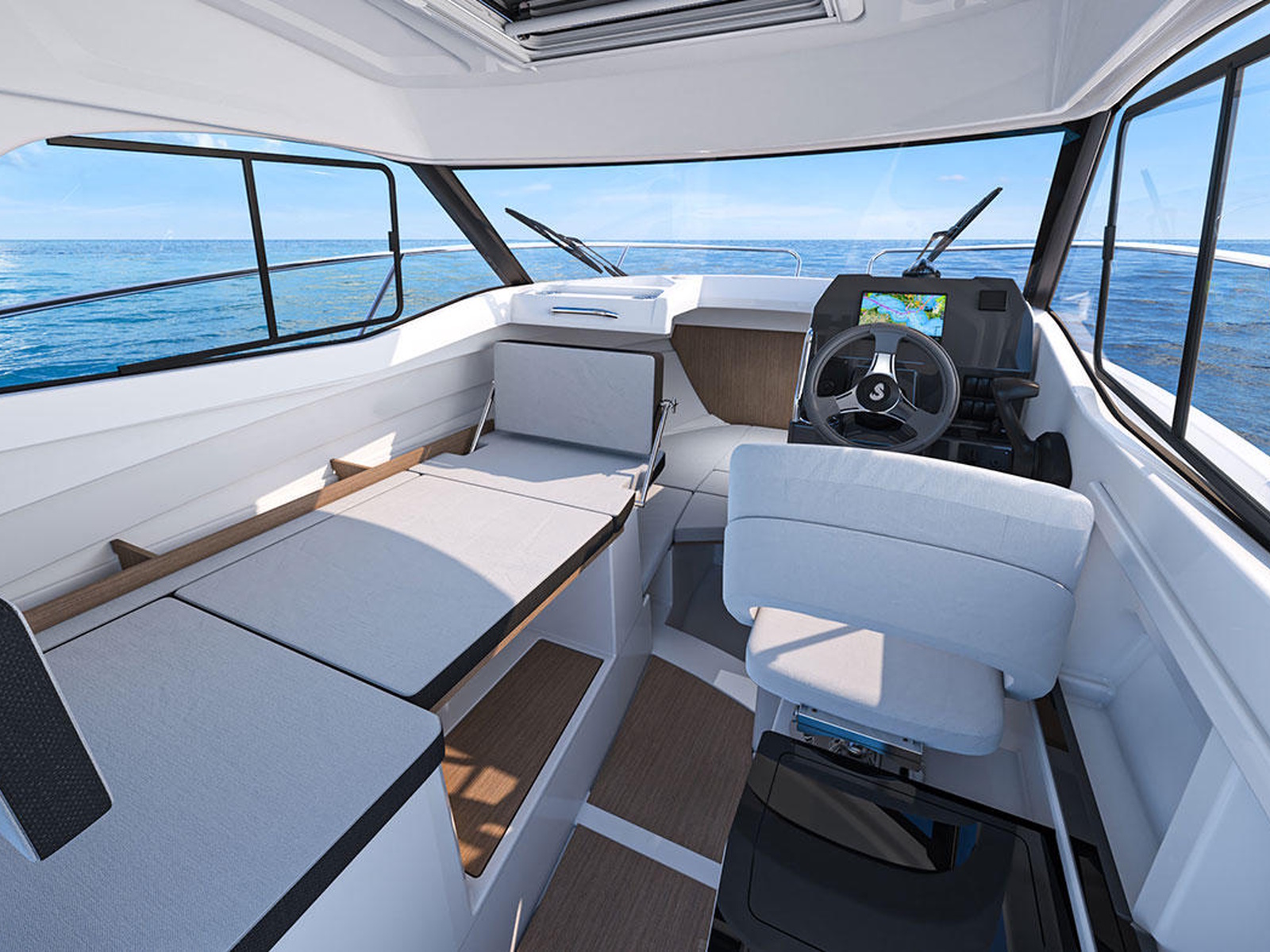 The care taken in designing the Antares 7 silhouette follows into the saloon, which has a particularly attractive helm station. Fitted with an all-black dashboard in a single piece, it elegantly compliments the boat's overall finish. The many glazed windows and ventilation openings offer all passengers superb panoramic views and excellent aeration. The cabin's numerous storage spaces and modularity make for a very comfortable life on board.