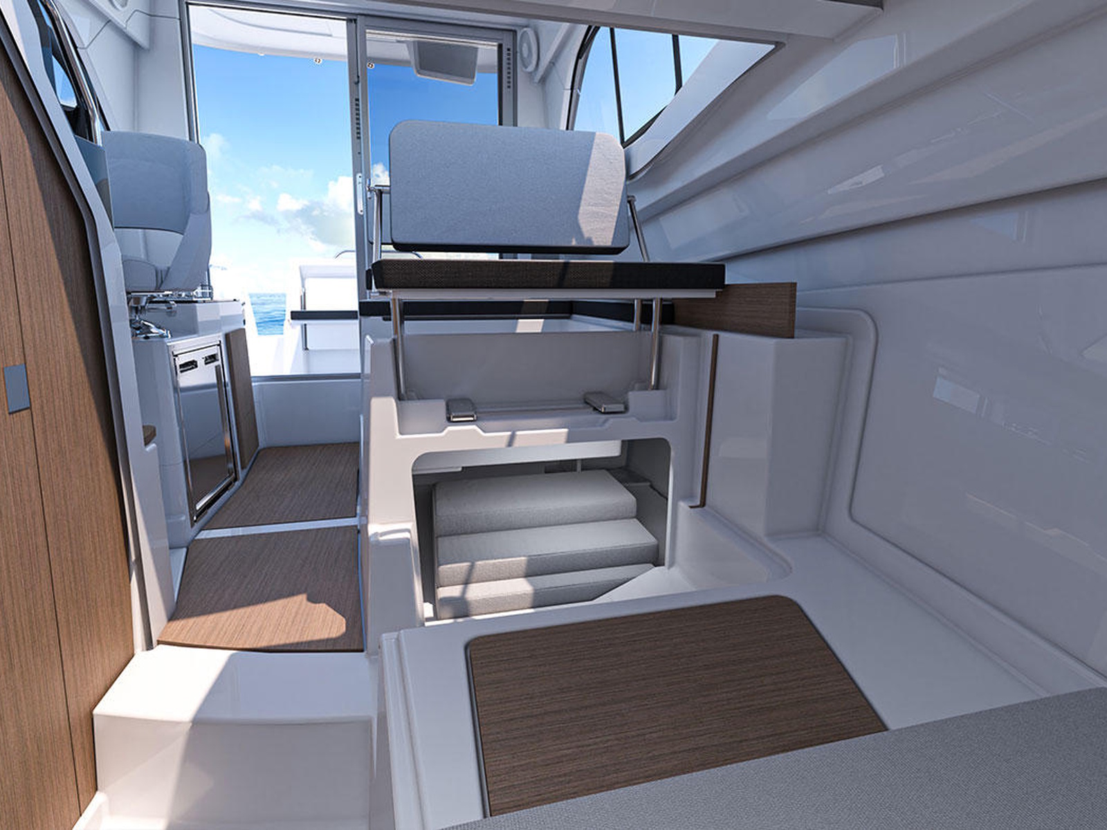 The Antares 7 saloon offers outstanding comfort. Modularity is enhanced by a swivelling pilot's seat, and a co-pilot benchseat that tilts in an instant to face the second benchseat, or to create a berth. The galley area is located behind the pilot's seat.