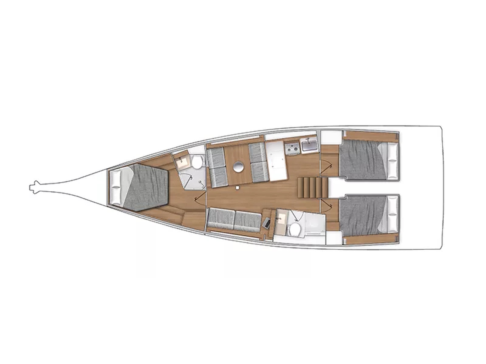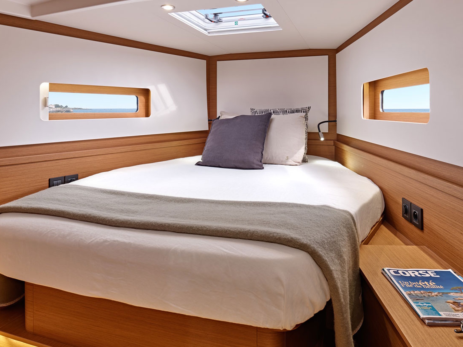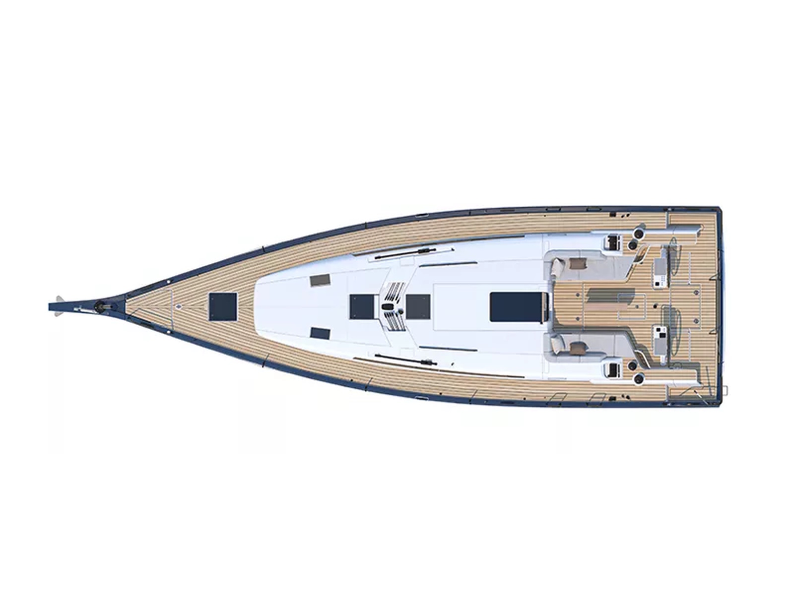On board the First 44, the cockpit is very convivial with a lovely cockpit table as well as its fluidity with a level access to the large clear gangways. Four winches, a fixed centerline block for the mainsheet and a mast that is set further aft all maximize the potential of her modern sailplan, defined by a slender mainsail and generously sized foresails. Two 350-litre ballast tanks, which can be activated electrically from the helm consoles, make it possible to maintain the boat's full potential.