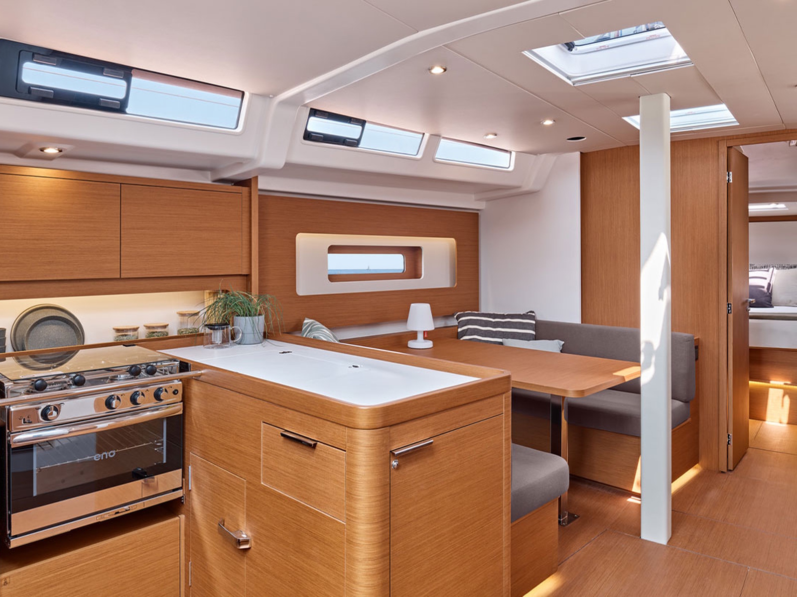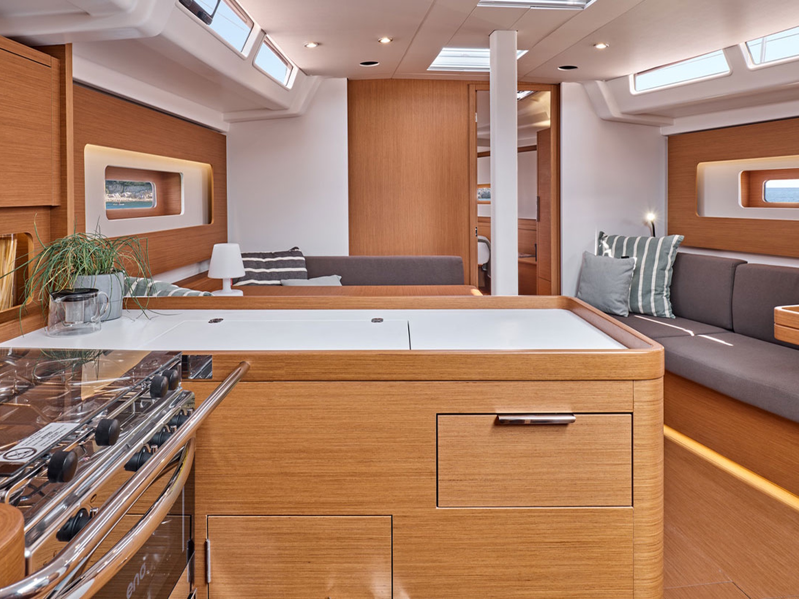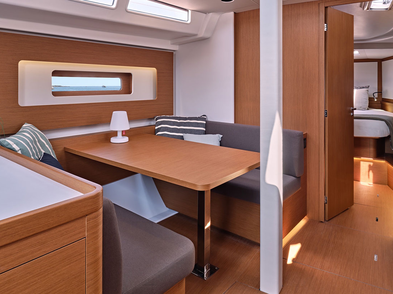 In the saloon, the transverse table seats up to six people and faces the sofa and navigation station; its position in relation to the mast facilitates circulation between the galley and the owner's cabin, enhancing the feeling of space.