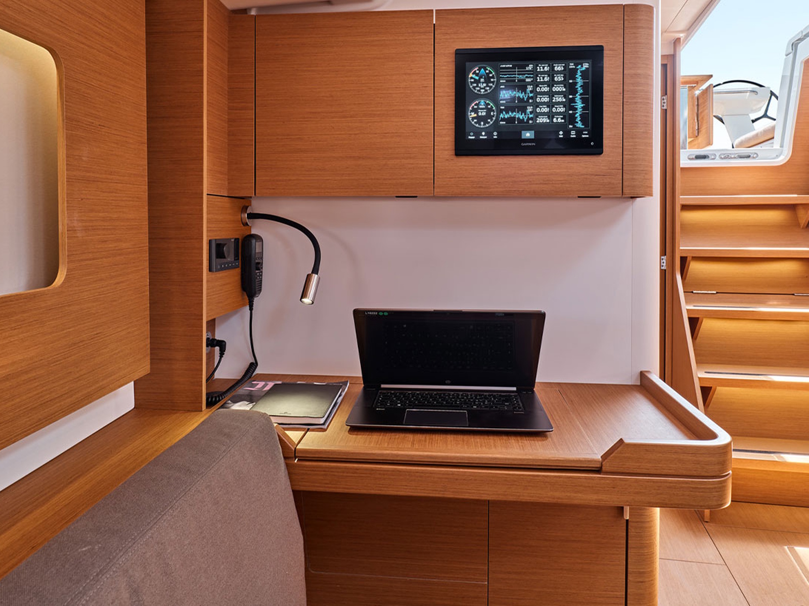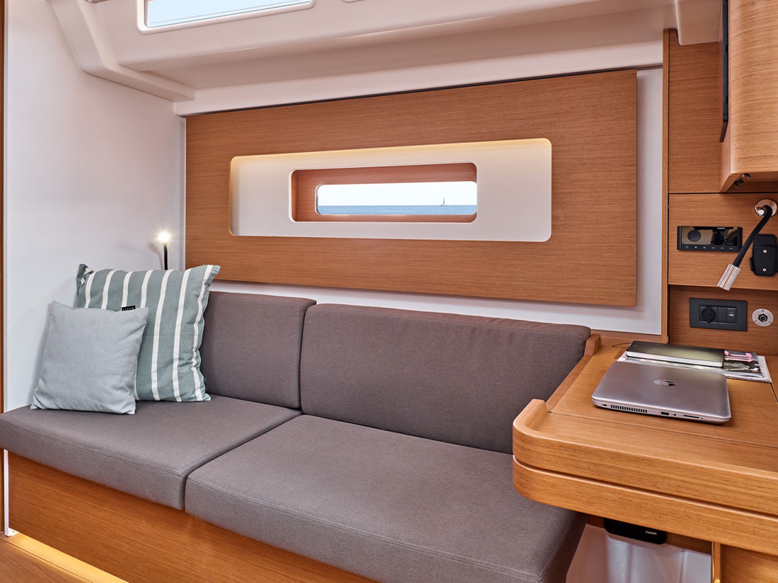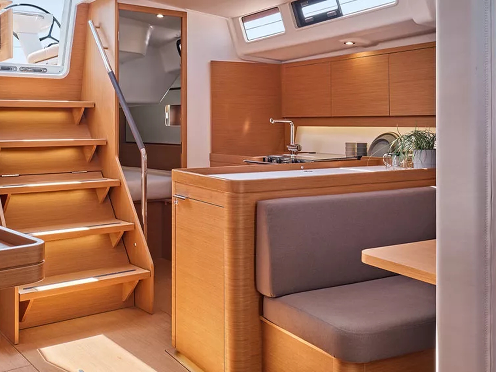 In the saloon, the transverse table seats up to six people and faces the sofa and navigation station; its position in relation to the mast facilitates circulation between the galley and the owner's cabin, enhancing the feeling of space.