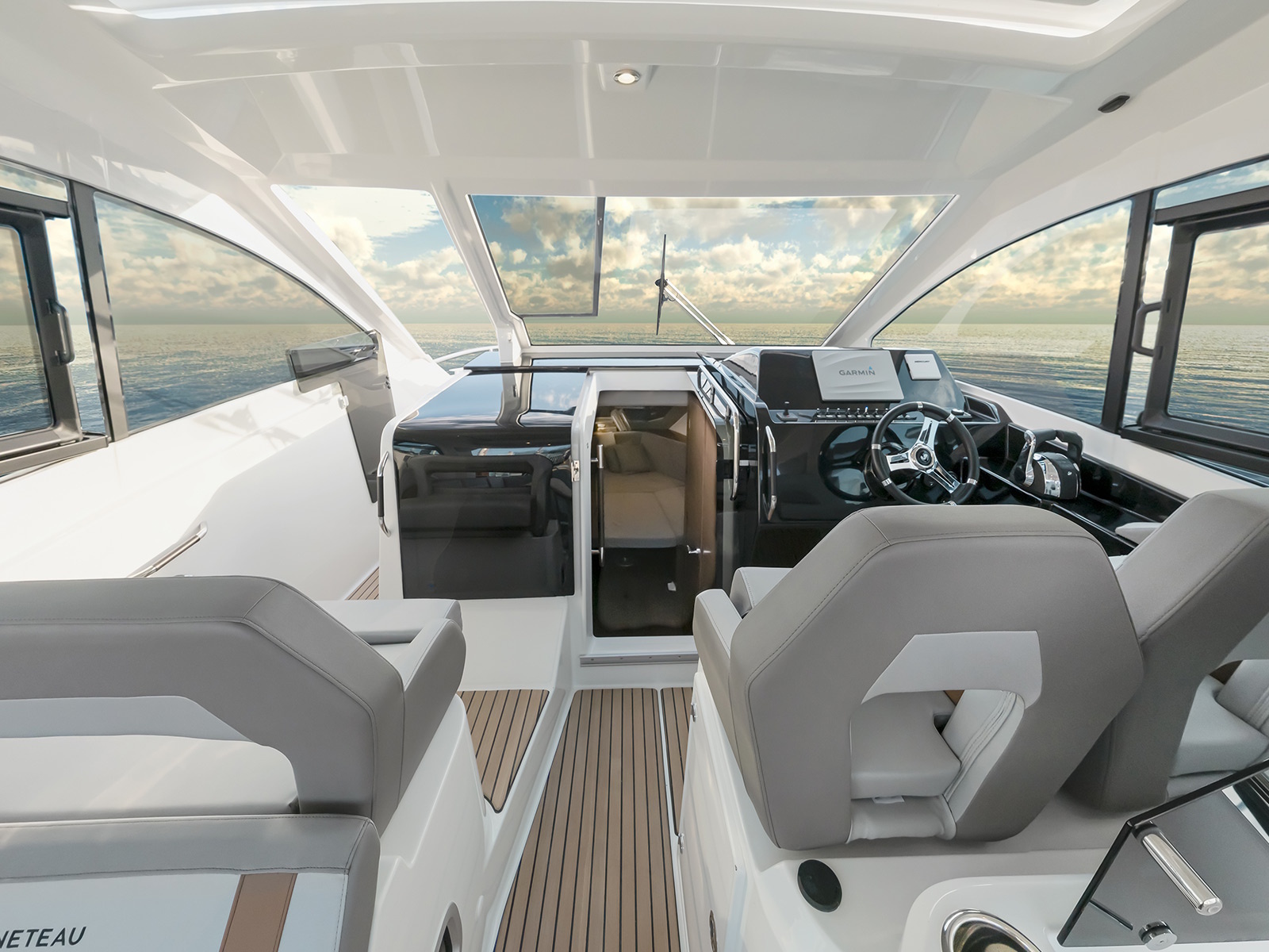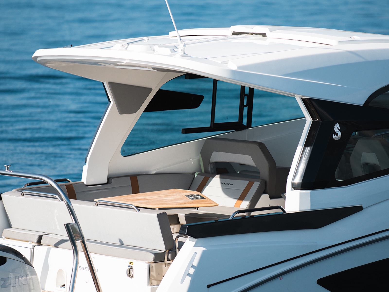 Its glass hard top provides outstanding visibility with efficient protection of the steering station. Two bolster seats facing the steering console are combined with a wide double bench seat the port side, enabling four people to fully enjoy the sensation of cruising.