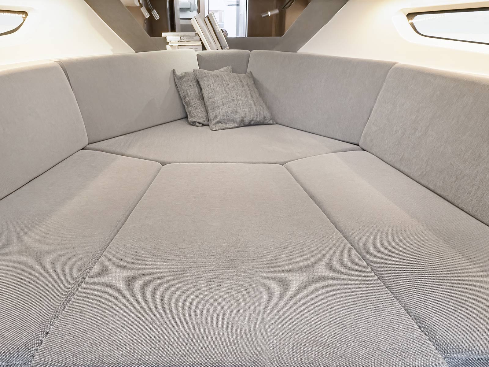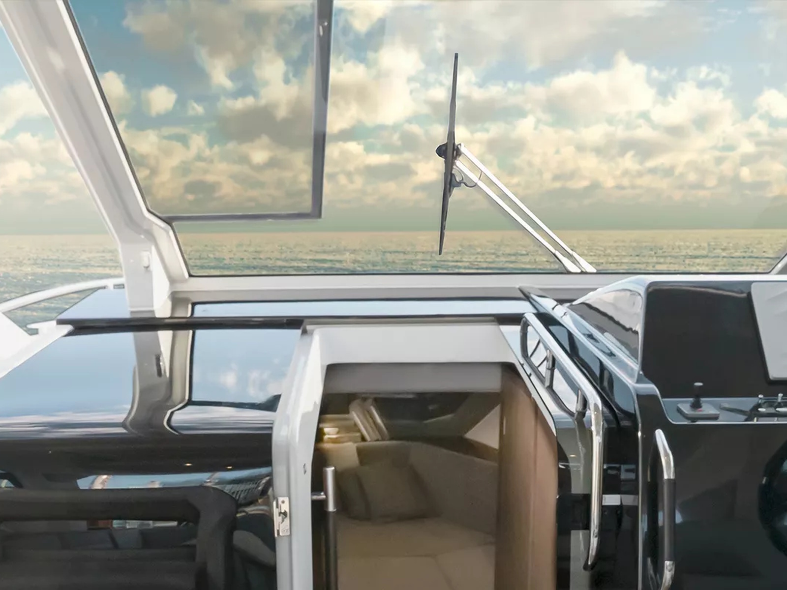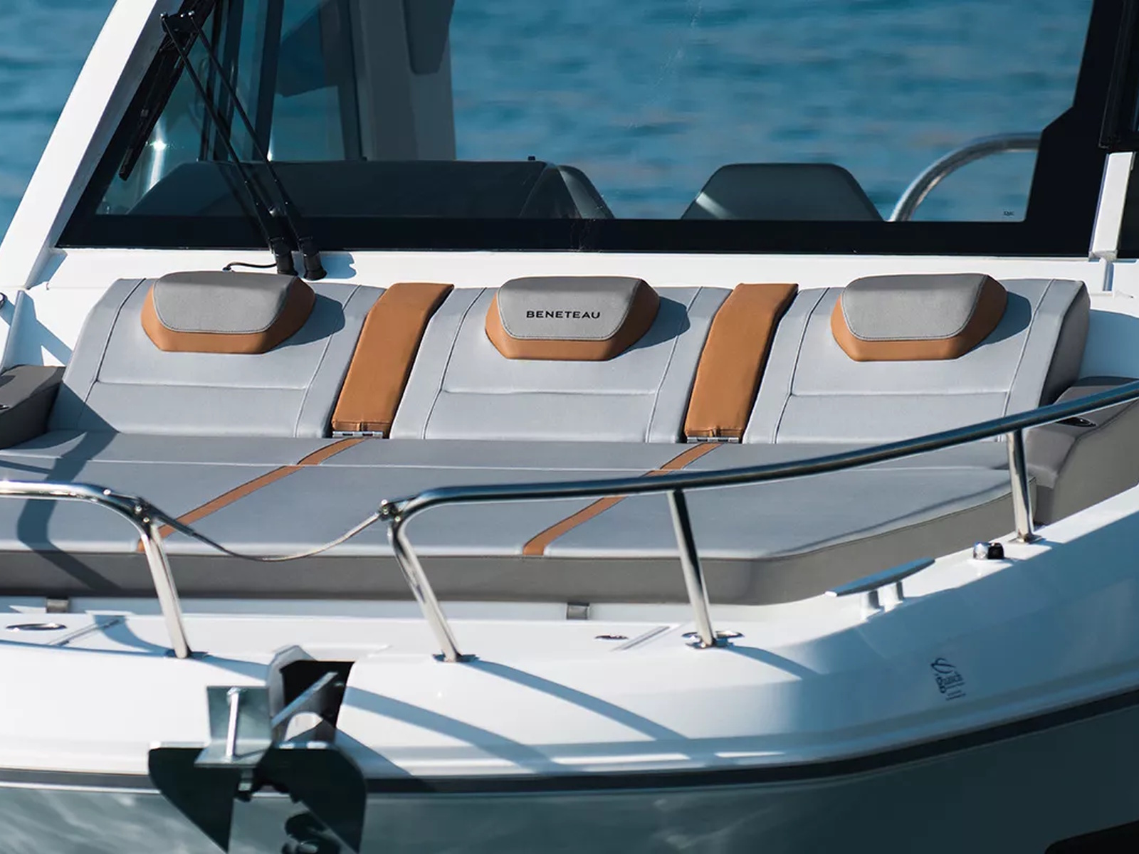 The full-width cockpit enhances the aft relaxation space: the lounger and the folding bench can be converted into a large sunbathing area. Accessible via the safe semi-walkaround passage, the foredeck also features a perfectly integrated sunbathing area for 3 people.