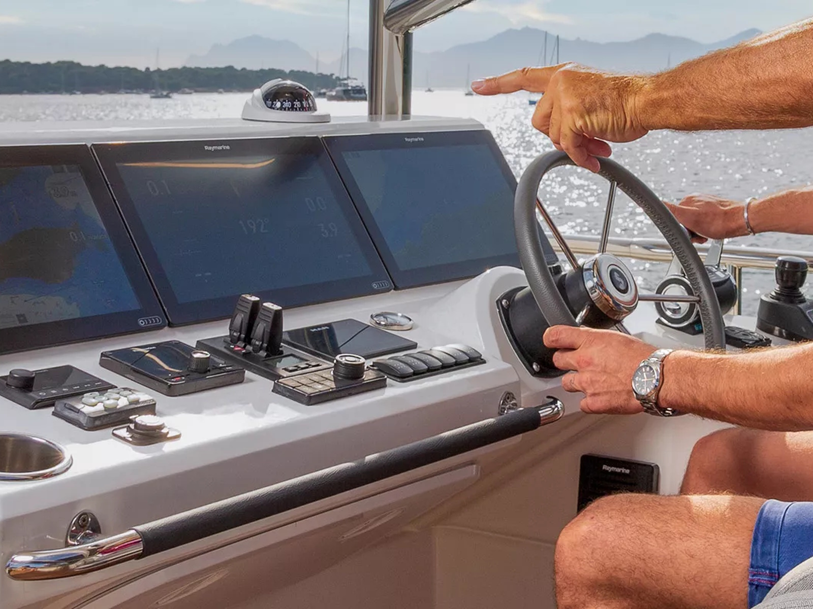 The newly redesigned helm station—drawing inspiration from the Swift Trawler 54—features floating MFD screens and a new Xenta electric steering system, offering a modern, responsive, and pleasant piloting experience.