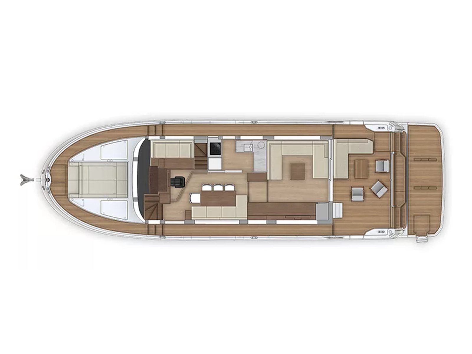 - The central raised pilot station allows commanding views with relaxing chaise to port and option co-pilot seat for pleasant passagemaking