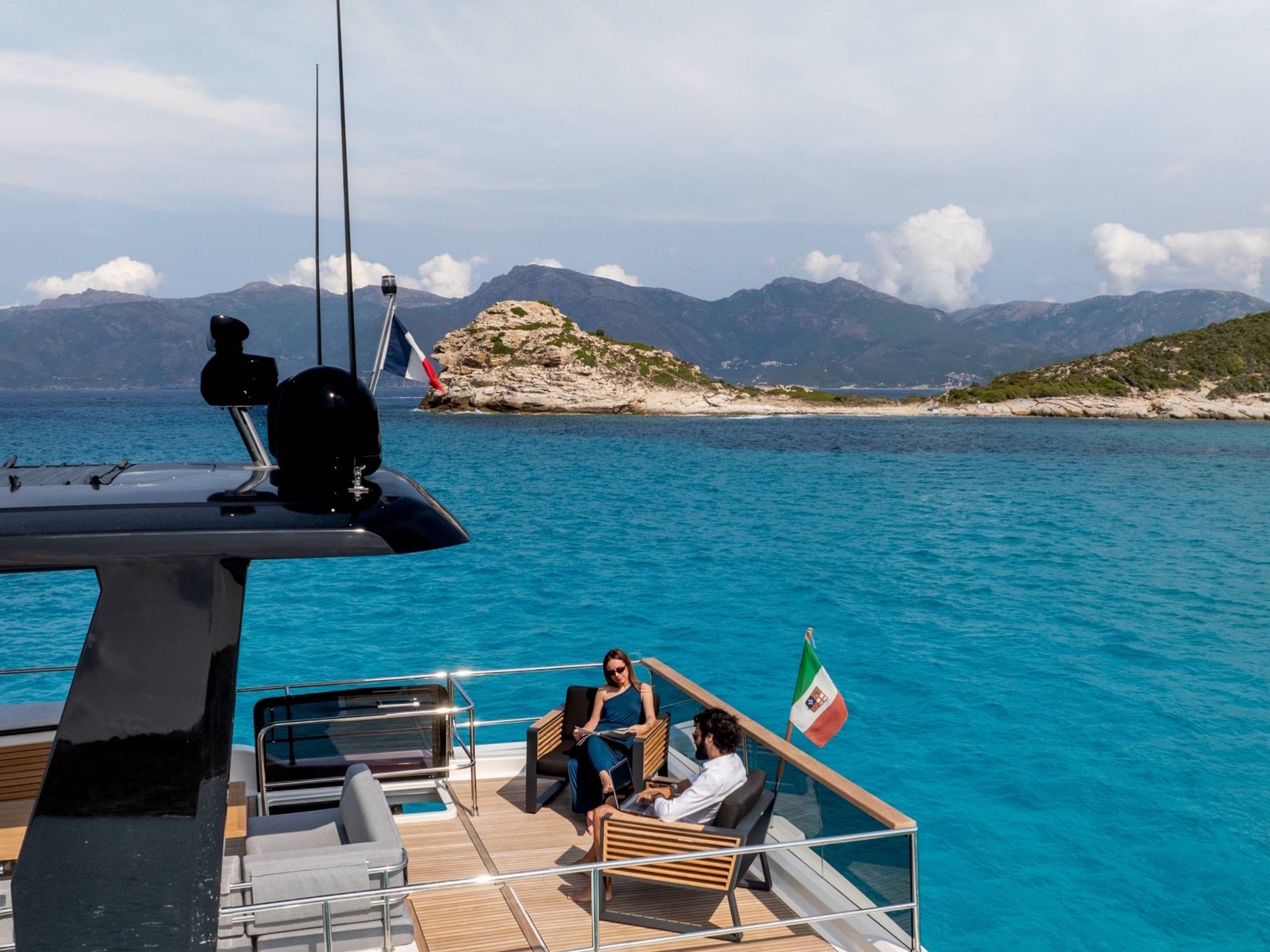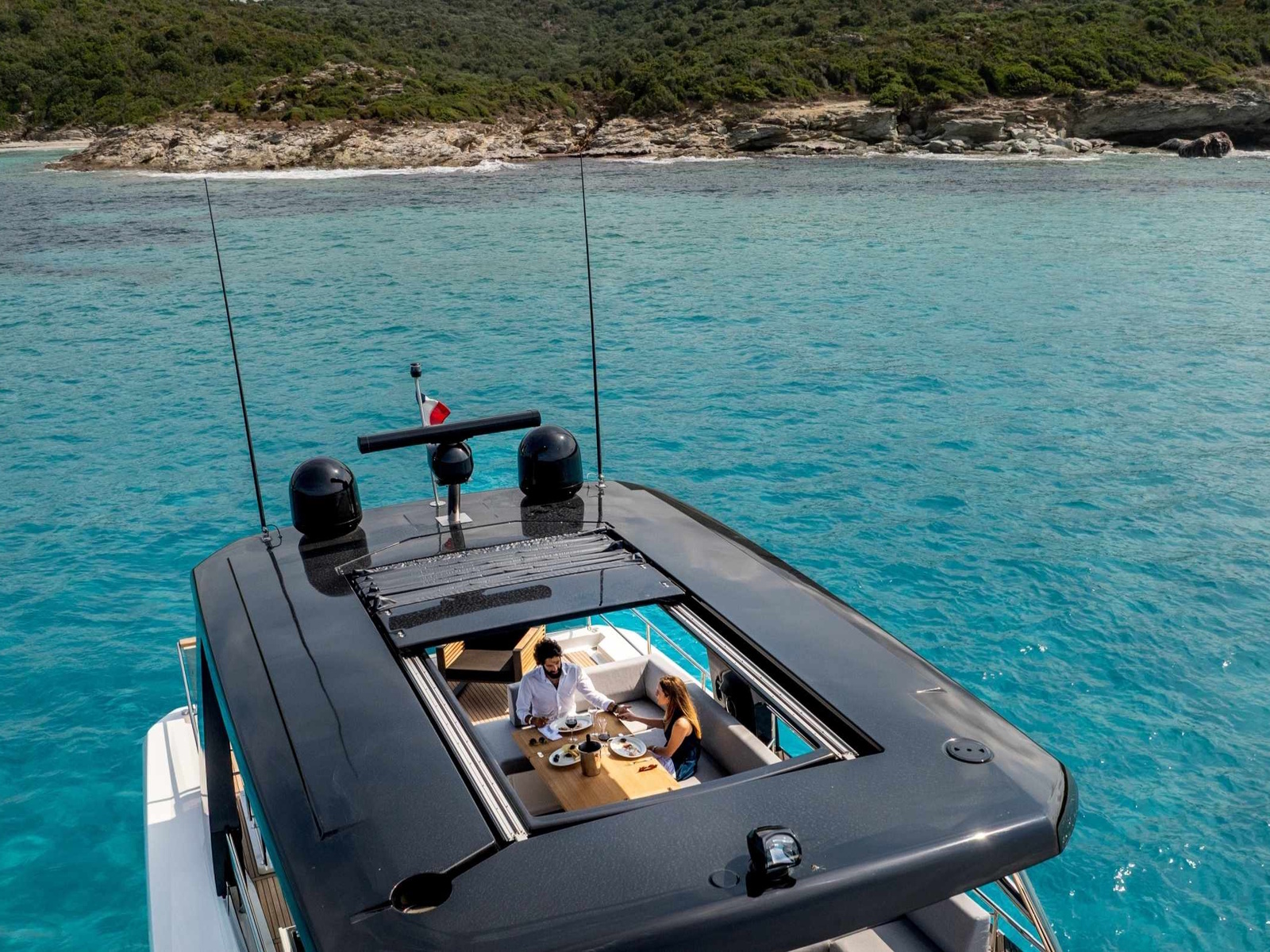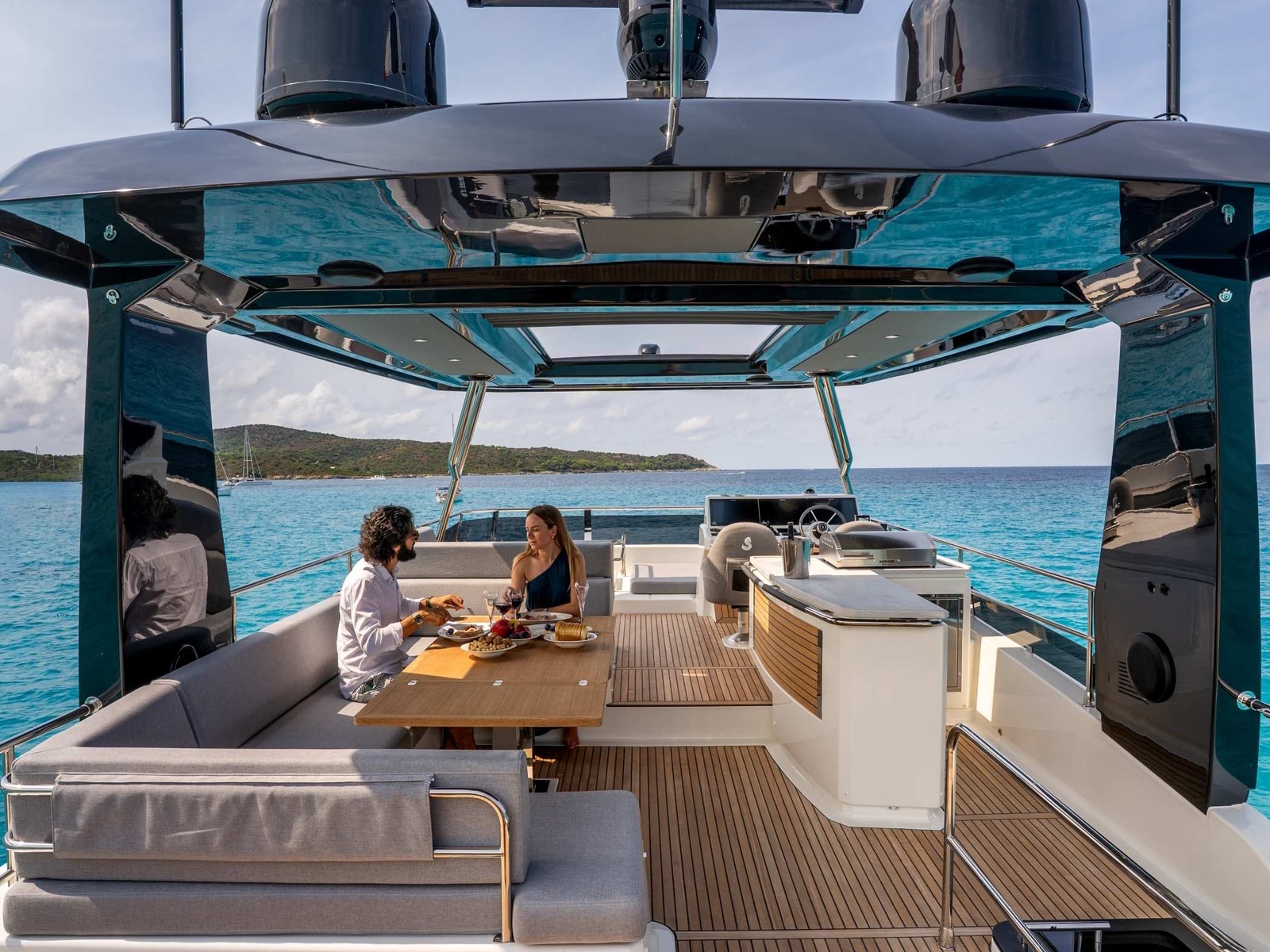 - The aft part of the flybridge is a great space with the possibility of installing two sun loungers and an optional tender crane