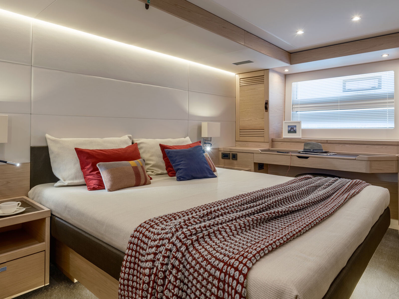 - The amidships full beam owner's cabin features plentiful storage with portside vanity desk and spacious en-suite
