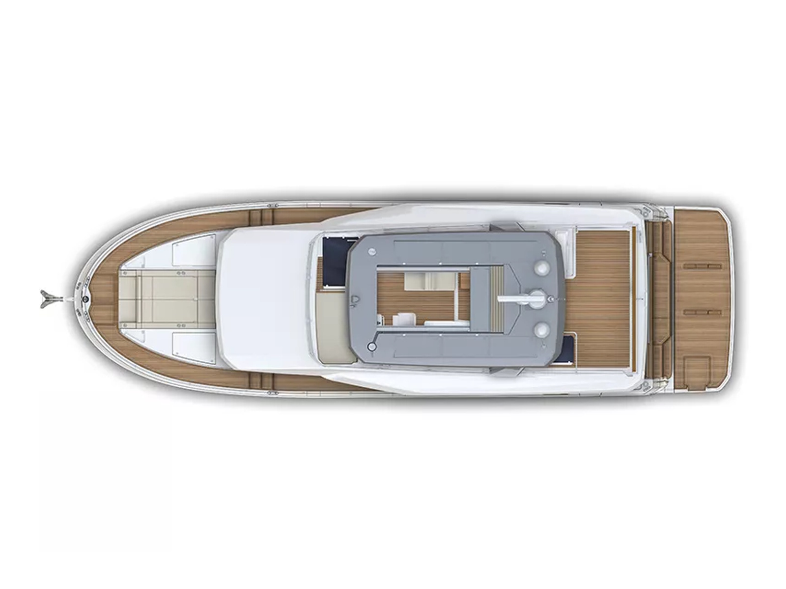 - Flybridge T-top available with sliding sunroof, aft bimini & solar panels
