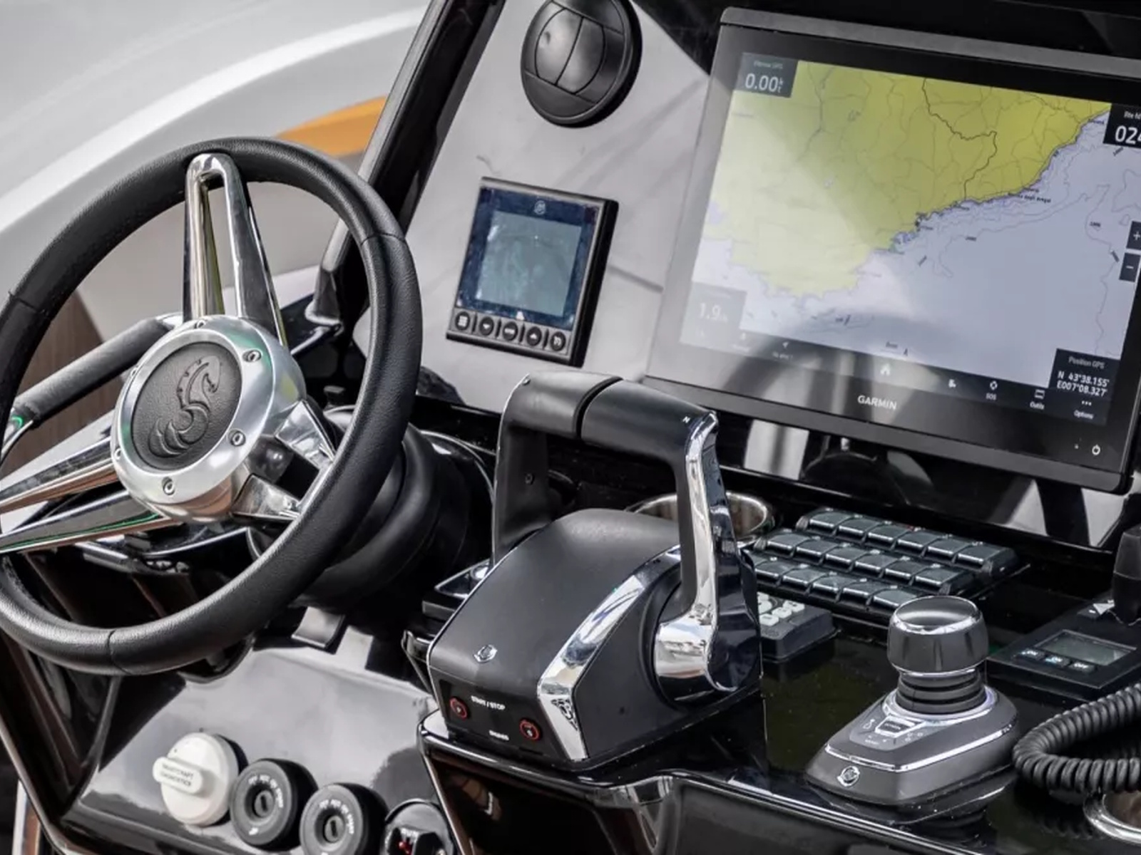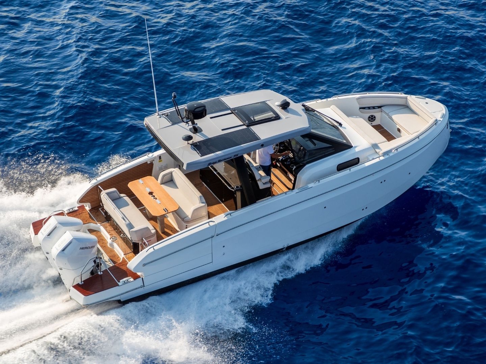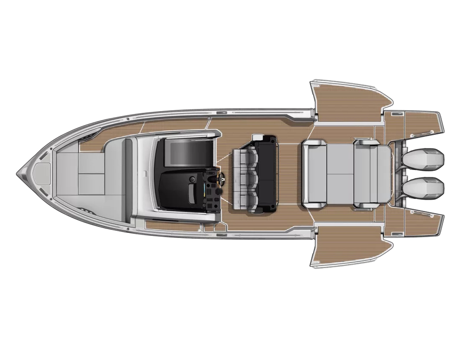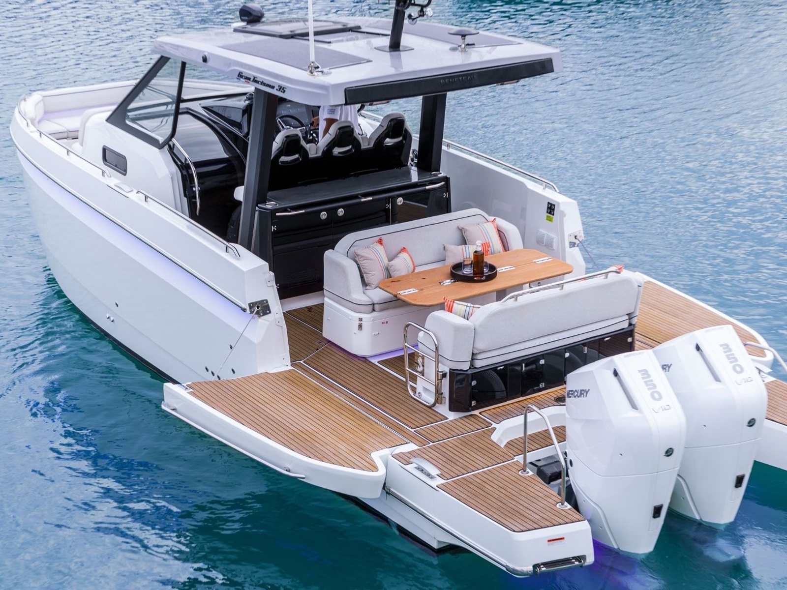 Powered by twin Mercury Verado outboards, the base Gran Turismo 35 reaches over 41 knots, delivering thrilling speed and diamond-cut handling. Docking and close-quarter maneuvers are a breeze with joystick control, and picture-perfect helm station ergonomics make this a boat that is just begging to be driven.
