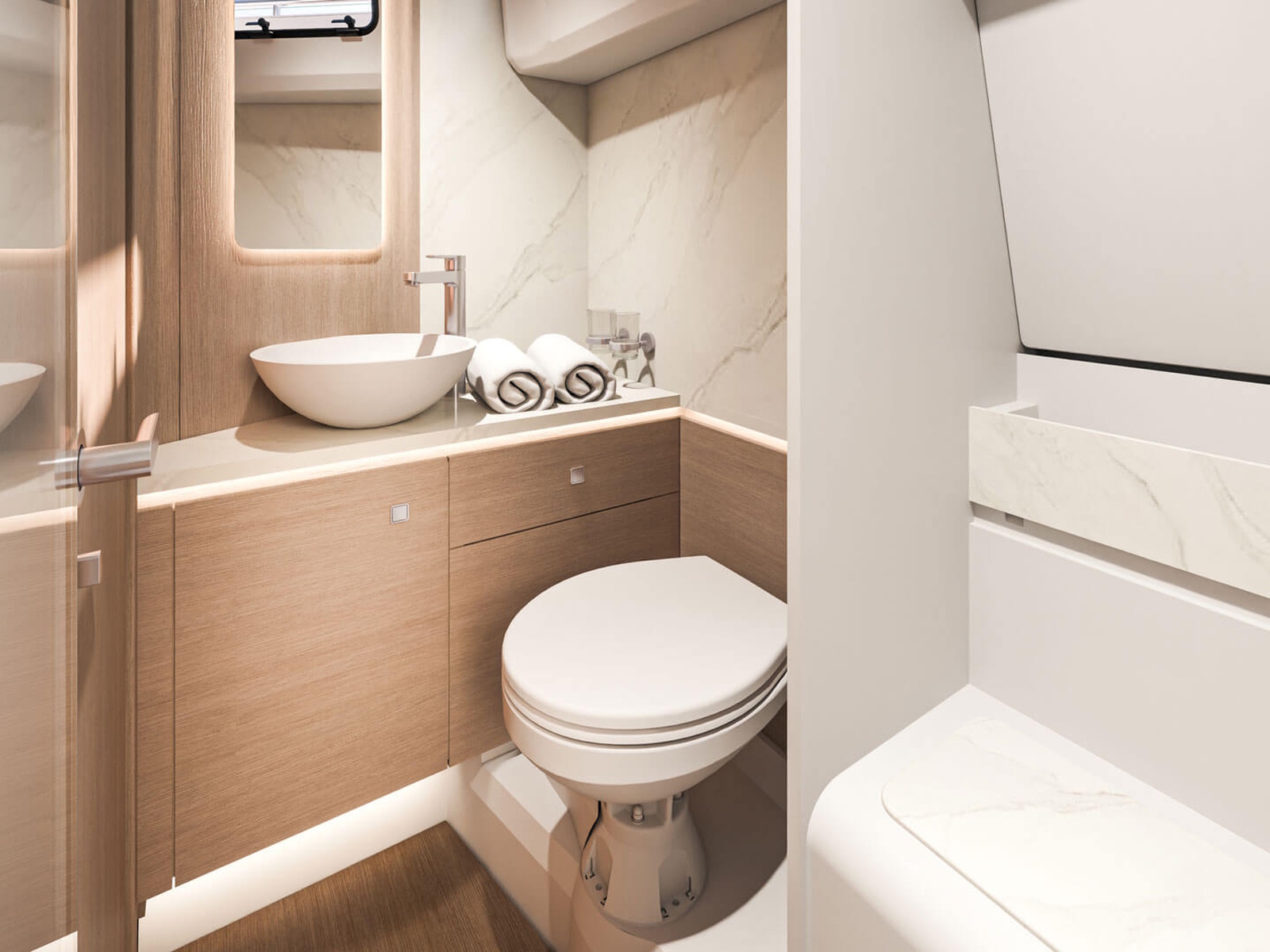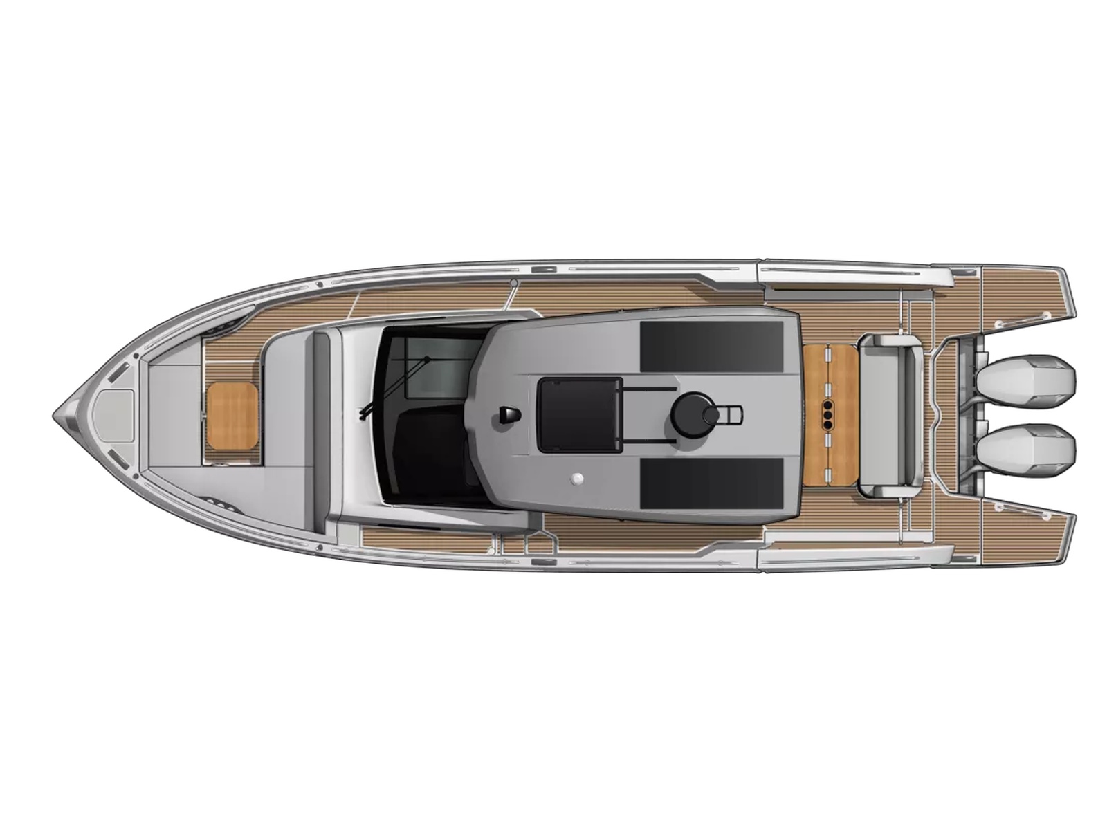 With light wood finishes, abundant light and modern design elements, the Gran Turismo 35 interior is as beautiful as it is functional. The convertible forward berth provides both a comfortable lounge and a spacious double bed. A mid cabin with berth completes the interior with refinement. A voluminous fully enclosed head with shower and a well-equipped galley make it perfect for weekend escapes and overnight stays. With smart storage solutions, integrated lighting, and thoughtful details, the Gran Turismo 35 interior elevates your on-water living experience.