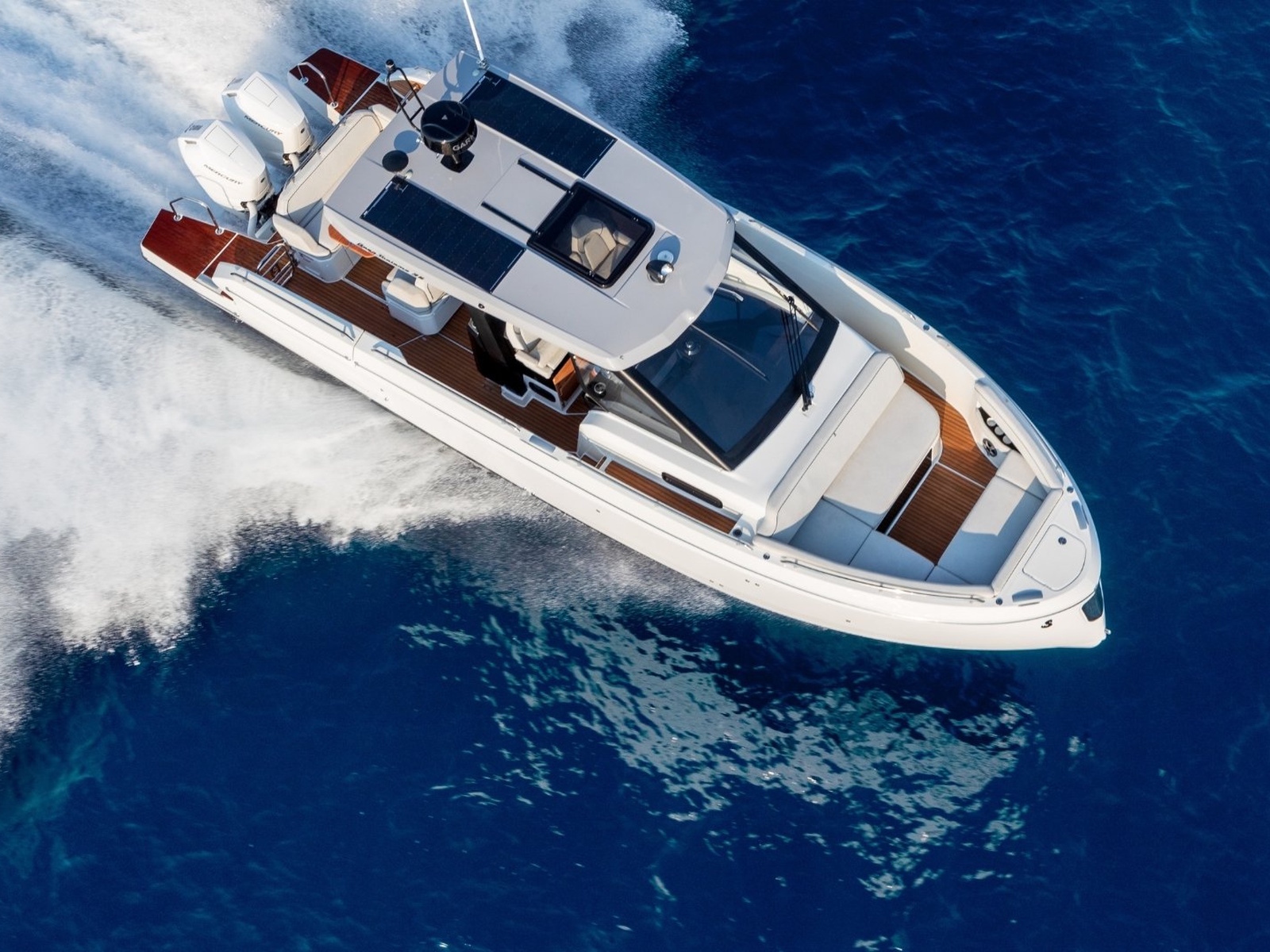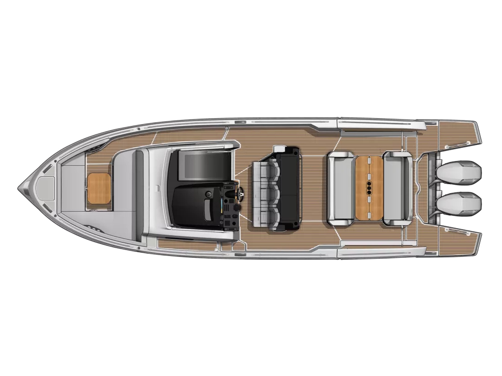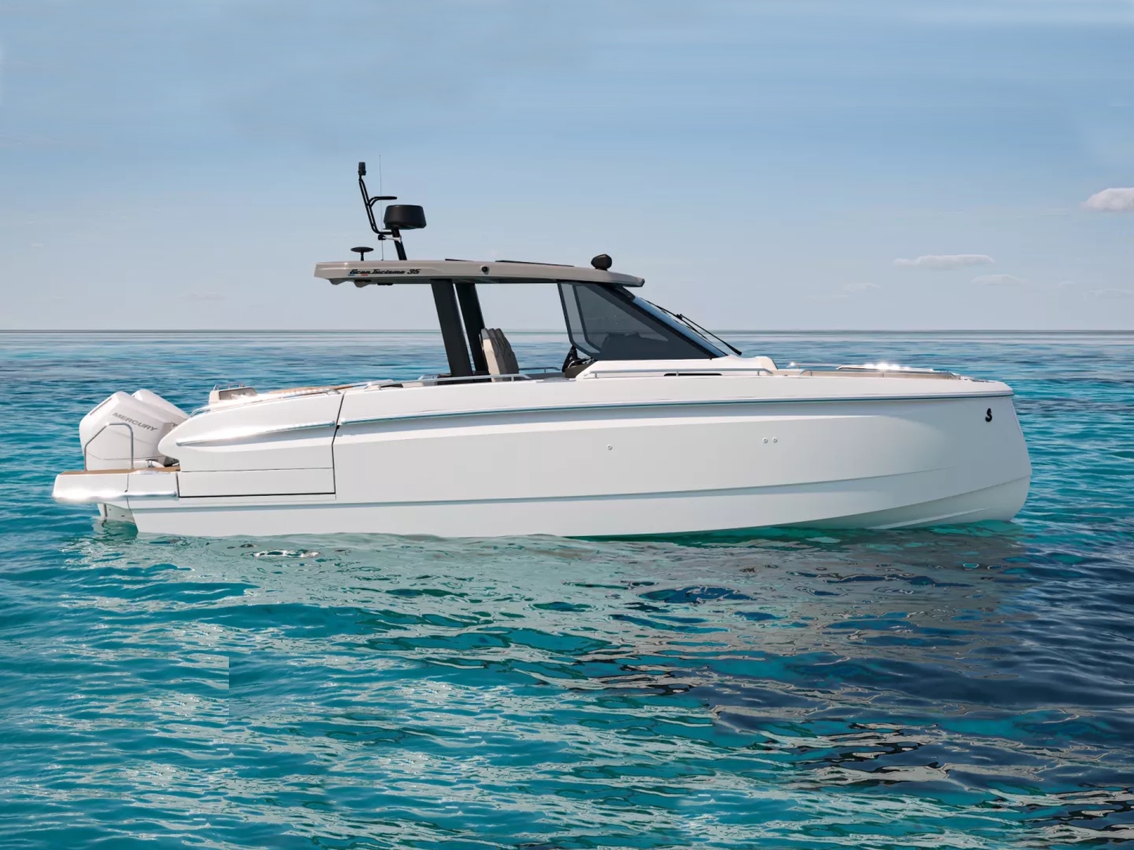 Powered by twin Mercury Verado outboards, the base Gran Turismo 35 reaches over 41 knots, delivering thrilling speed and diamond-cut handling. Docking and close-quarter maneuvers are a breeze with joystick control, and picture-perfect helm station ergonomics make this a boat that is just begging to be driven.