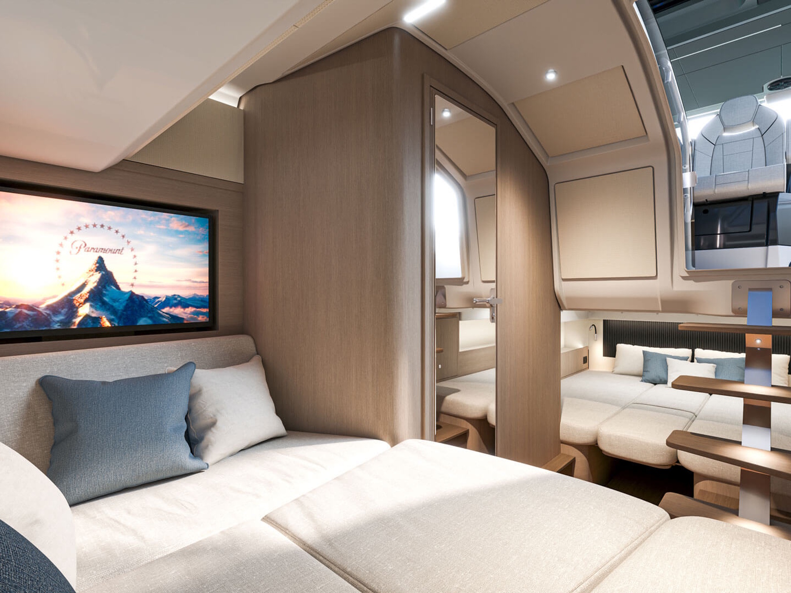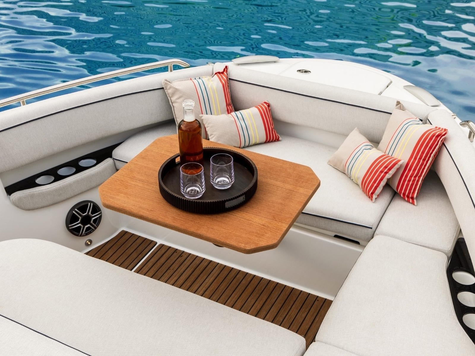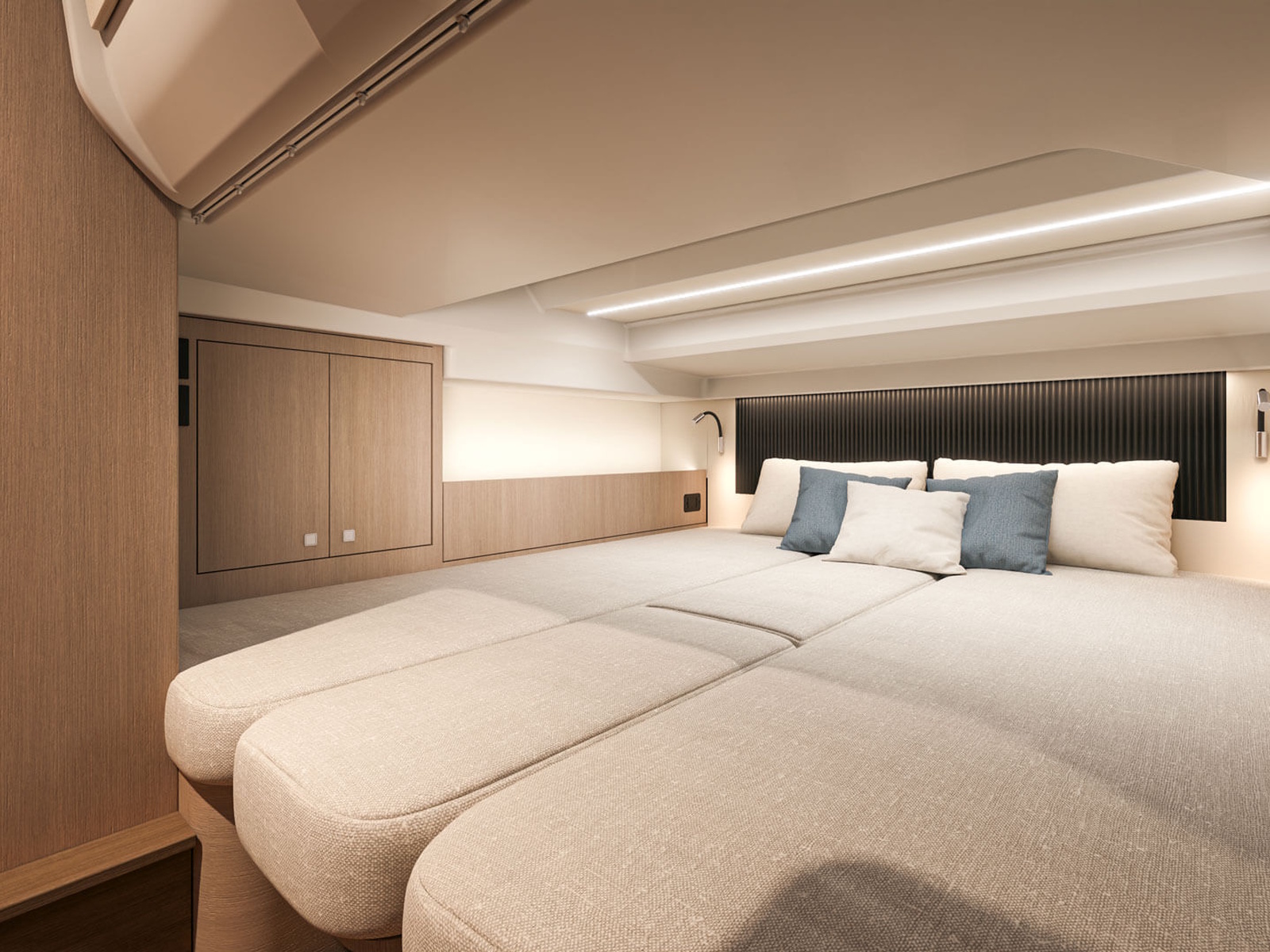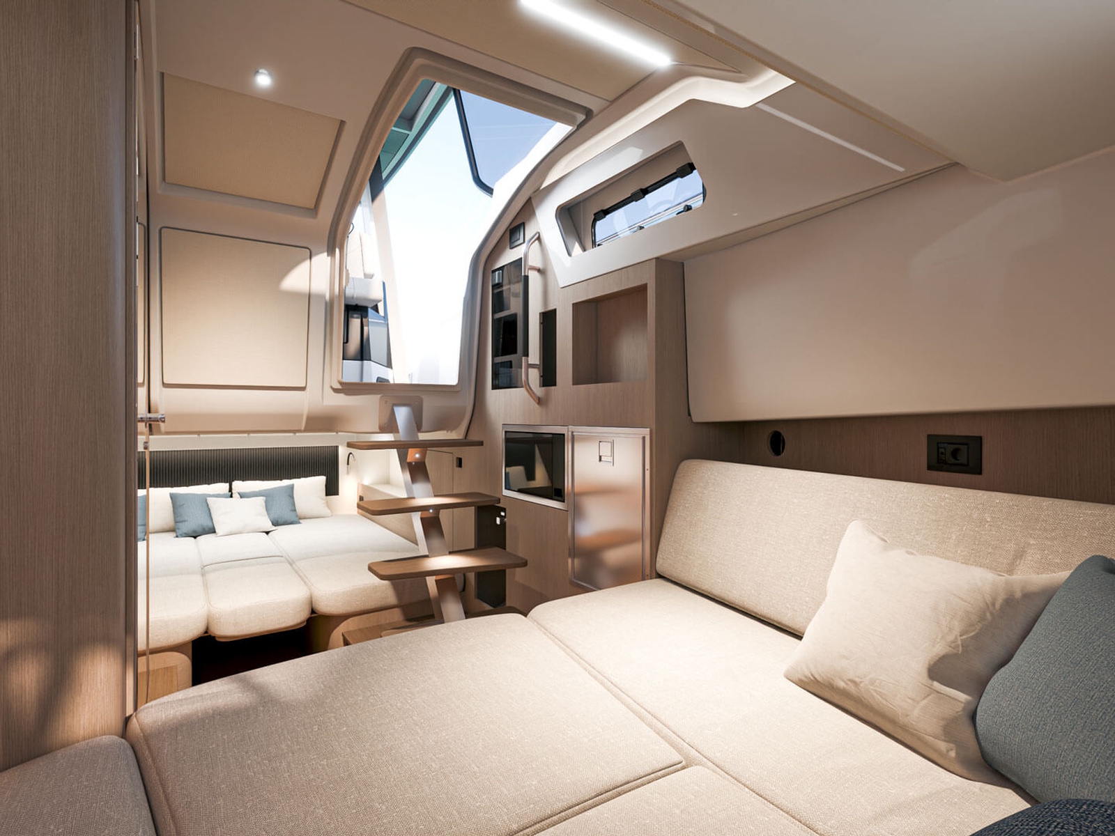 With light wood finishes, abundant light and modern design elements, the Gran Turismo 35 interior is as beautiful as it is functional. The convertible forward berth provides both a comfortable lounge and a spacious double bed. A mid cabin with berth completes the interior with refinement. A voluminous fully enclosed head with shower and a well-equipped galley make it perfect for weekend escapes and overnight stays. With smart storage solutions, integrated lighting, and thoughtful details, the Gran Turismo 35 interior elevates your on-water living experience.
