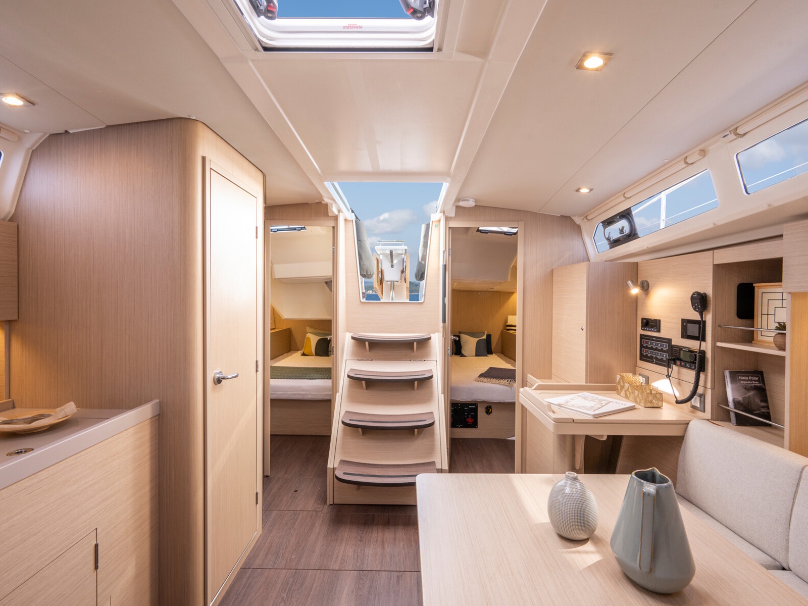 The saloon is offset to port with a sofa for relaxing and a comfortable table for six, facing the lengthwise galley.