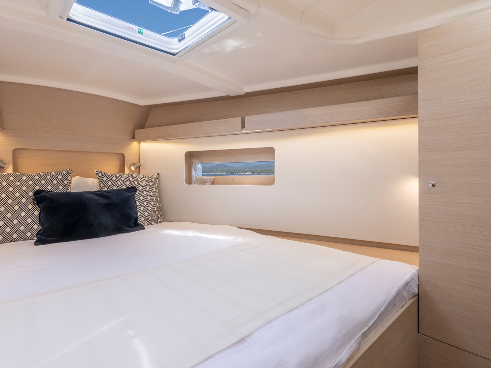 The fore cabin has a breathtaking view of the horizon through two large portholes integrated in the hull side. In the two-bathroom version, the bed is positioned against the starboard hull and is of generous proportions.