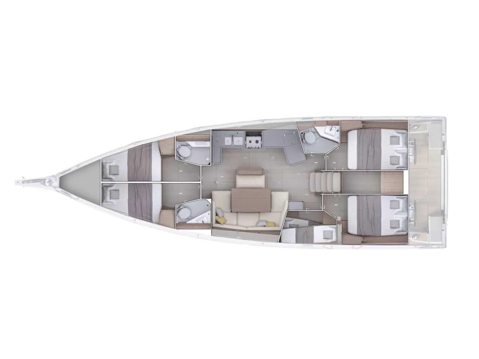 The owner's version includes three spacious cabins with two shower rooms, offering exceptional comfort, a dedicated chart table and an environment where the greatest care has been taken down to the smallest detail.
