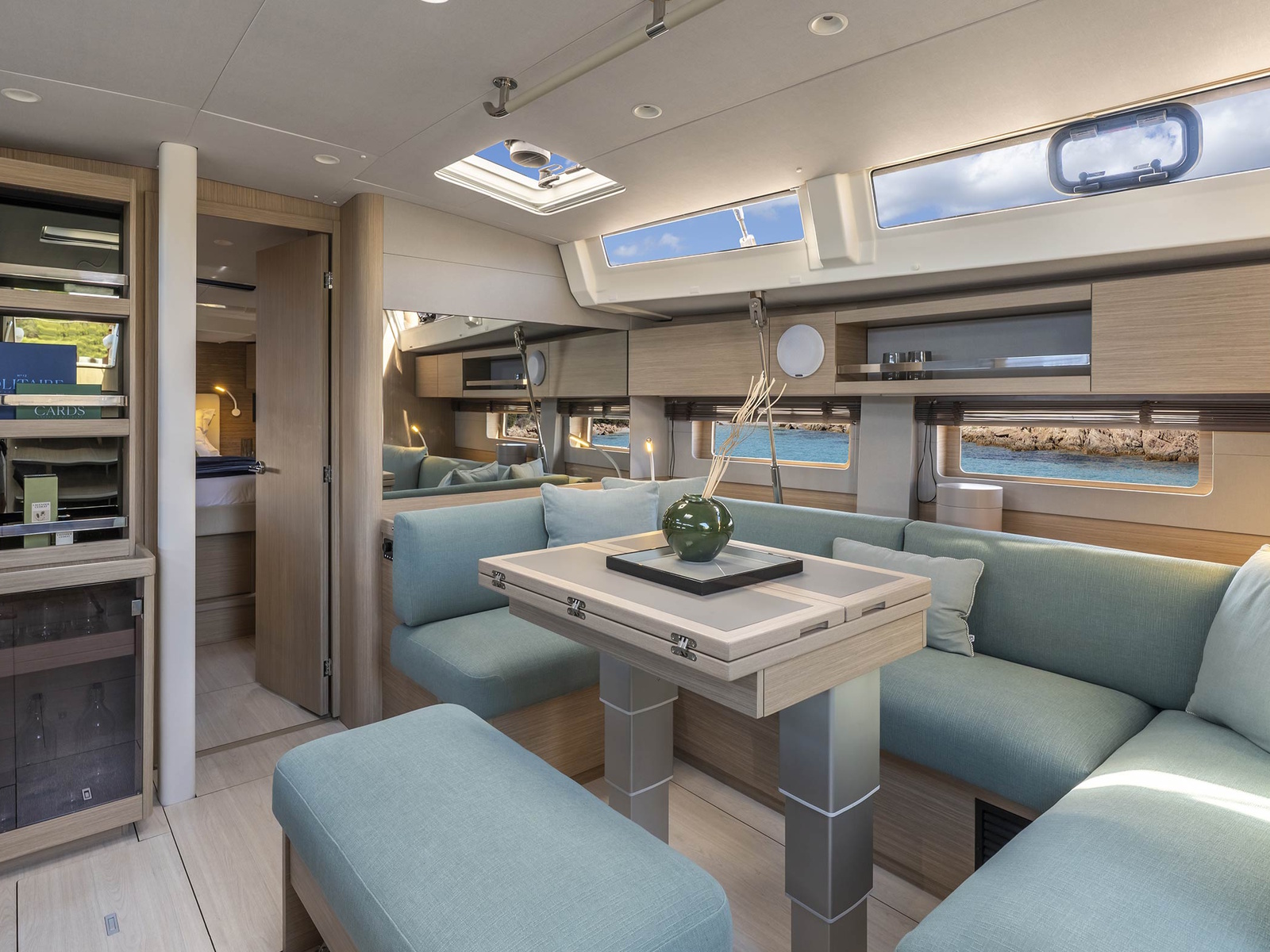 The Oceanis 52 cockpit is a blend of ergonomics and fluidity. The twin C-shaped benches create a diamond-shaped space, making it easy to move between the companionway and the lifting swim platform. With two height-adjustable tables, the cockpit is perfect for every moment of your cruise – drinks, meal or sunbathing. A central seating area, fitted with a fridge and a plancha grill, will make every anchorage that bit more special.