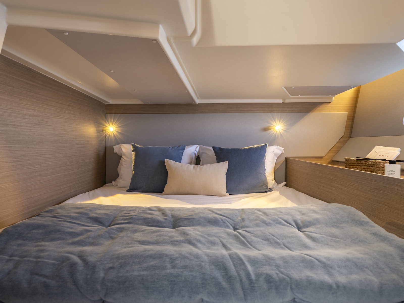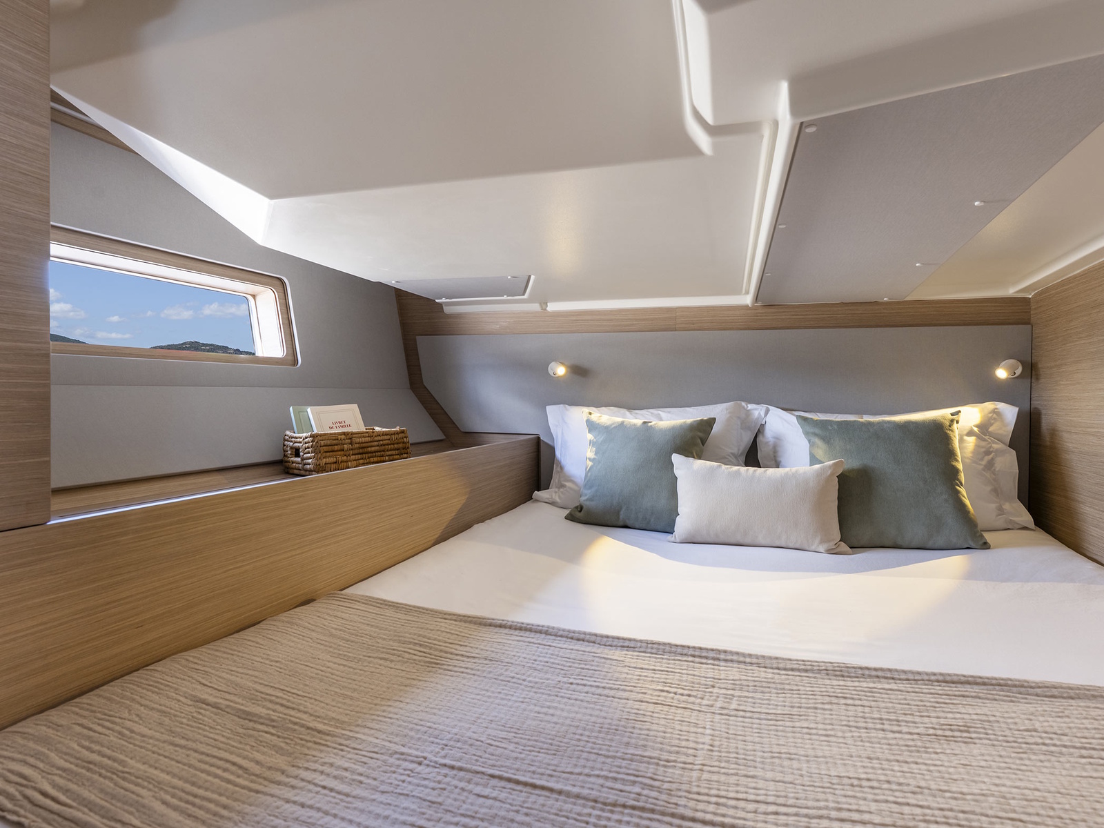You will love the owner’s suite, the focal point of this amazing interior, for its spaciousness and premium atmosphere. Designed for absolute comfort, it has an upholstered headboard, a spacious 160 cm bed, and plenty of storage space: two hanging lockers, large coaming compartments and a large drawer under the bed. The natural light pours through large portholes, which offer a stunning sea view, while the anti-glare spotlights and warm white ambient LEDs create an intimate atmosphere in the evening.