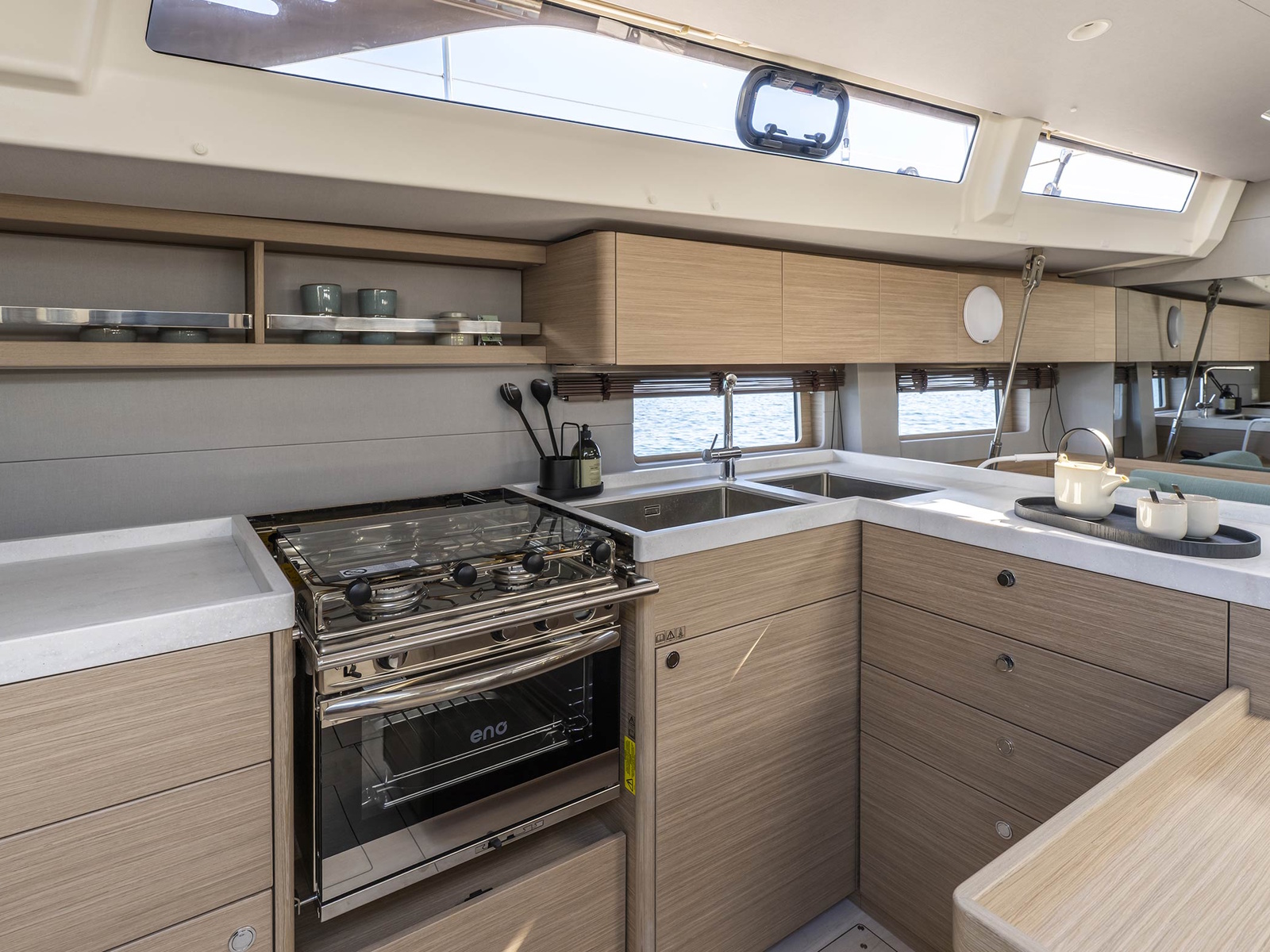 - Spacious galley with a full-height 434-litre fridge, two sinks for a greater work capacity, and a central galley island