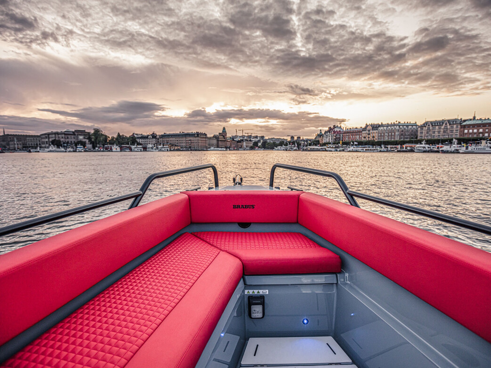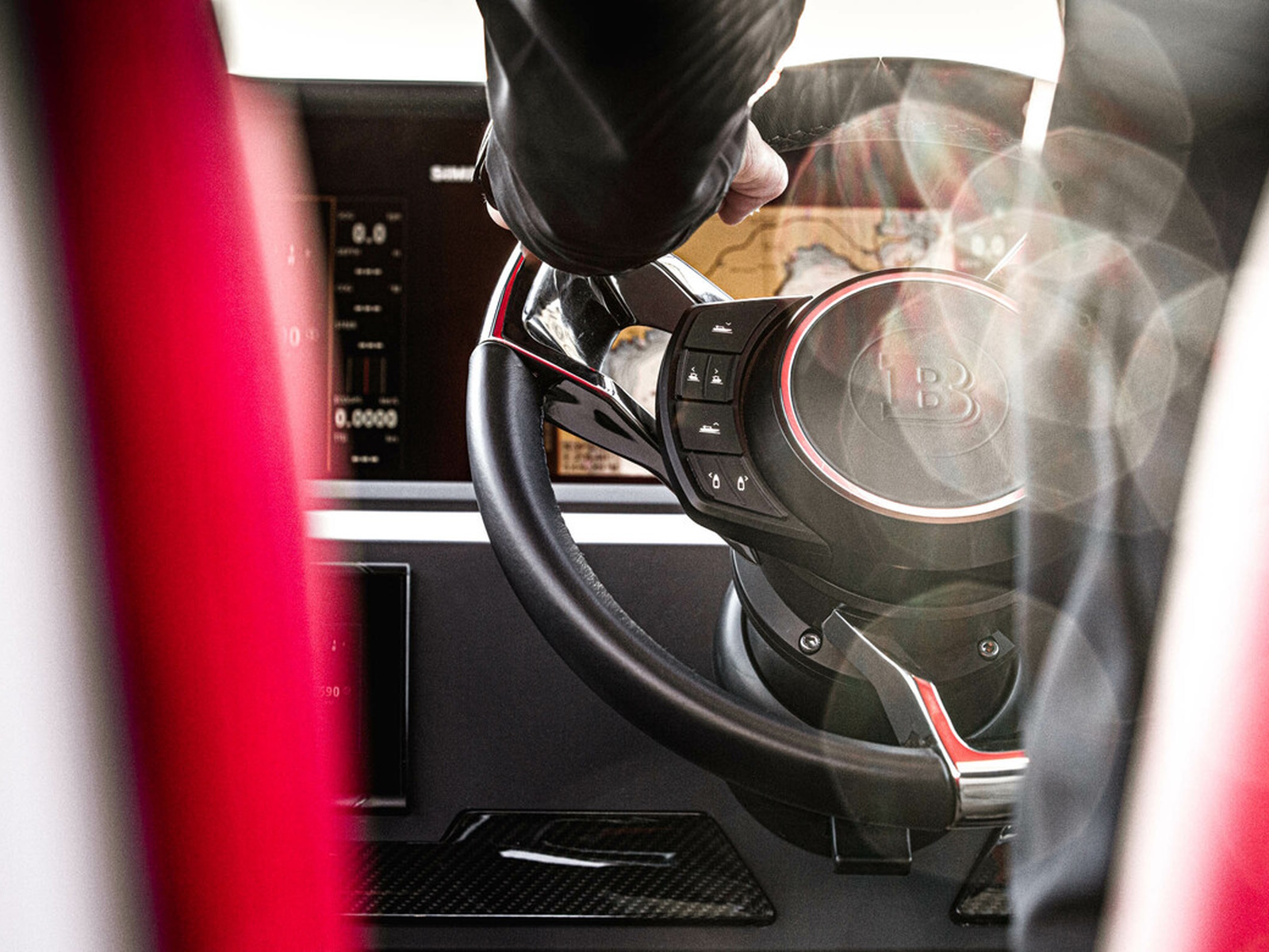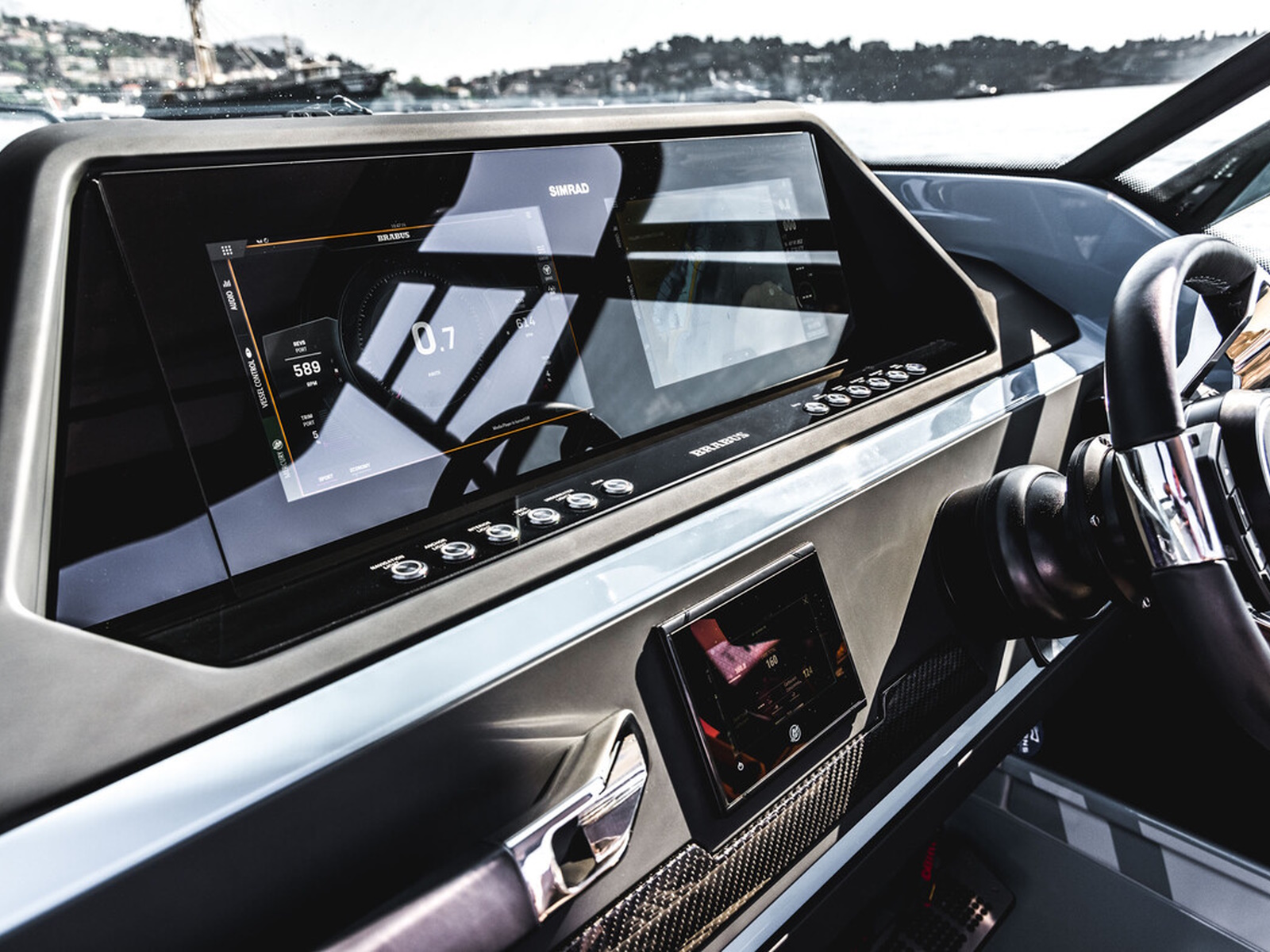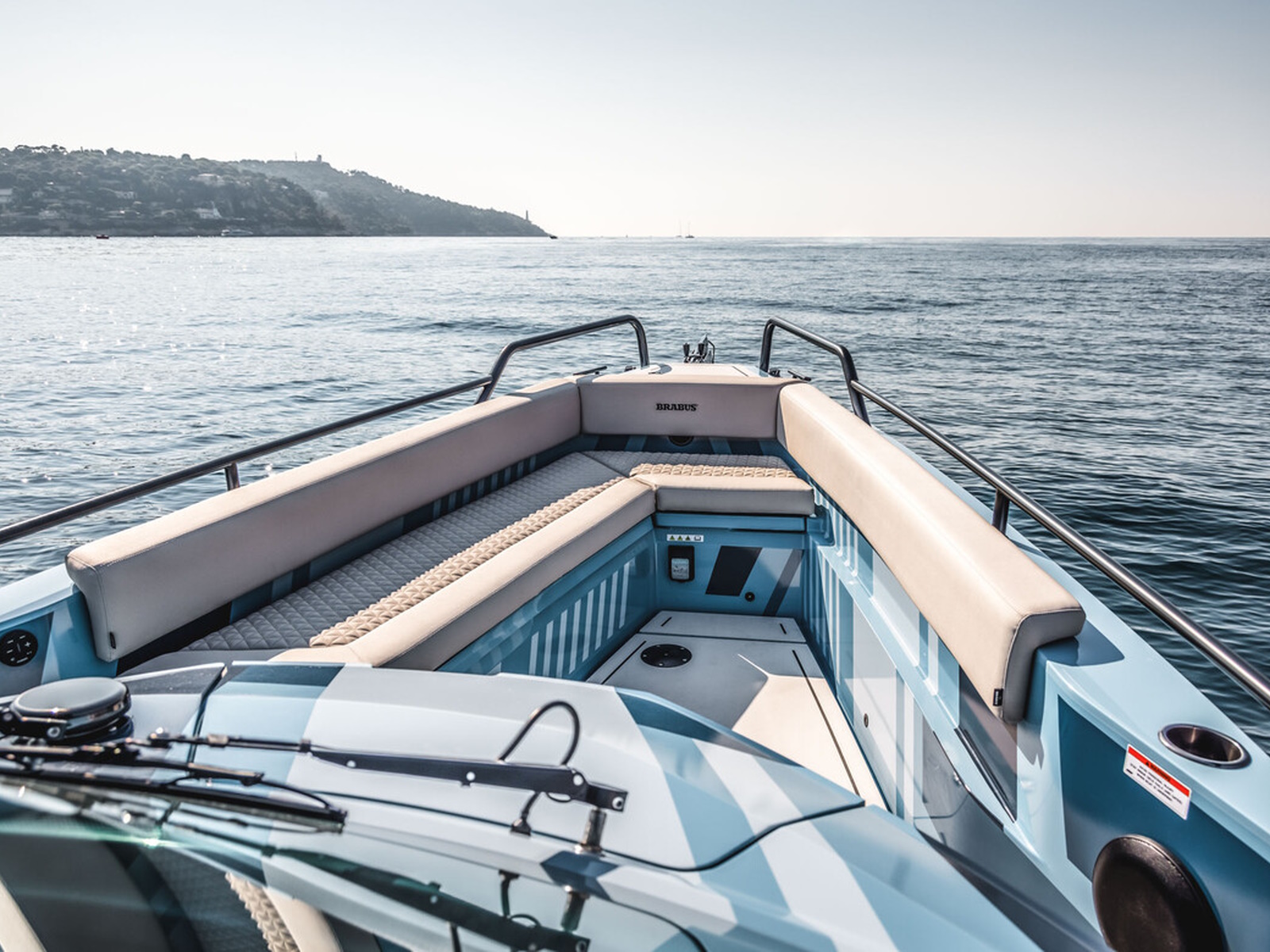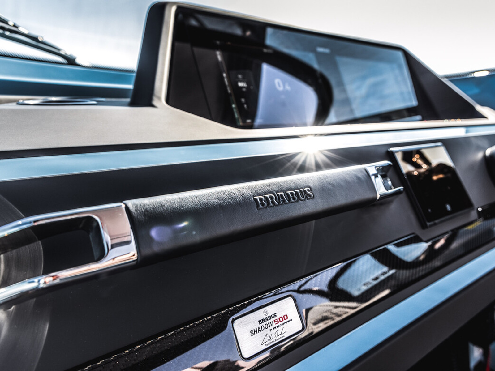 Carbon fibre - Visible carbon-fibre parts complete the ultra-cool looks of the dashboard and seat trims and further emphasizes the clean and high tech look of the boat. All carbon-fiber parts are made in-house and supplied directly to the boat factory from the BRABUS headquarters in Germany.
