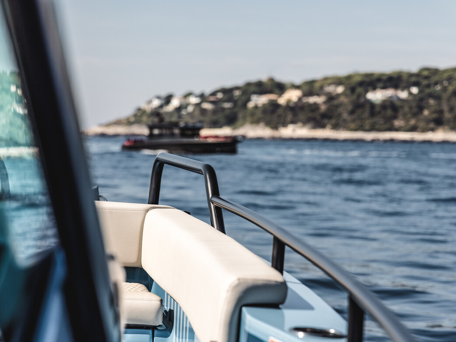 BRABUS aluminium steps - An exclusive aluminium step detail can also be found when entering the toilet compartment. The helm is completed with a BRABUS branded exclusive aluminium support for feet to complete the sporty looks but also to add to the ergonomics when driving the boat.