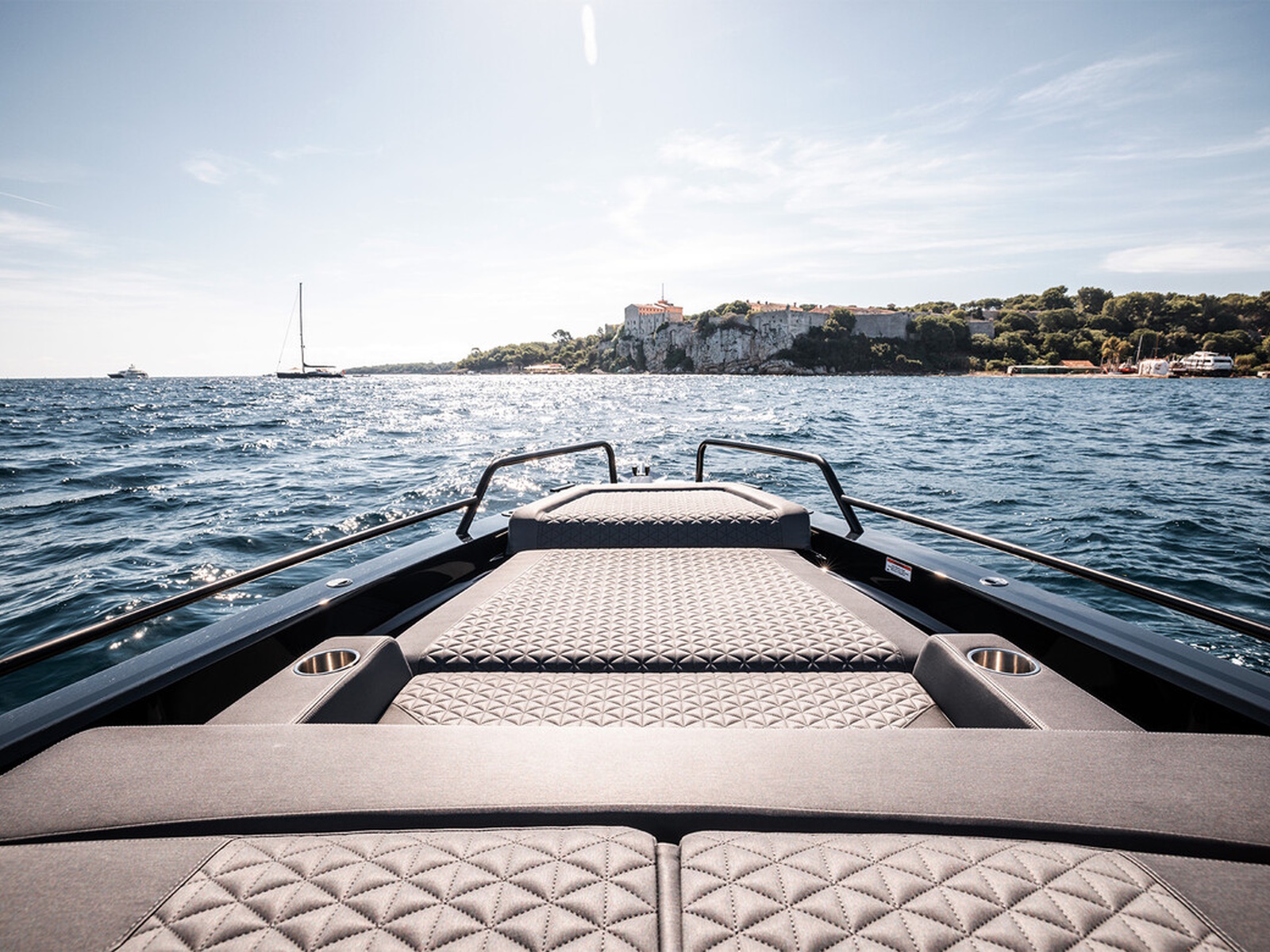Time for evolution - A highlight of the BRABUS Shadow 900 Black Ops Signature Edition is the is the Sun Lounge, which is now standard on all BRABUS Shadow 900 models, due to its high comfort-level and expanded social space on the front deck. A multitude of new features such as a new LED searchlight, black engine cowlings with gray or red accents according to individual upholstery color choices, revised fender box panels, wall pockets and LED bulwark step lights complement the boat’s irresistible BRABUS appeal.