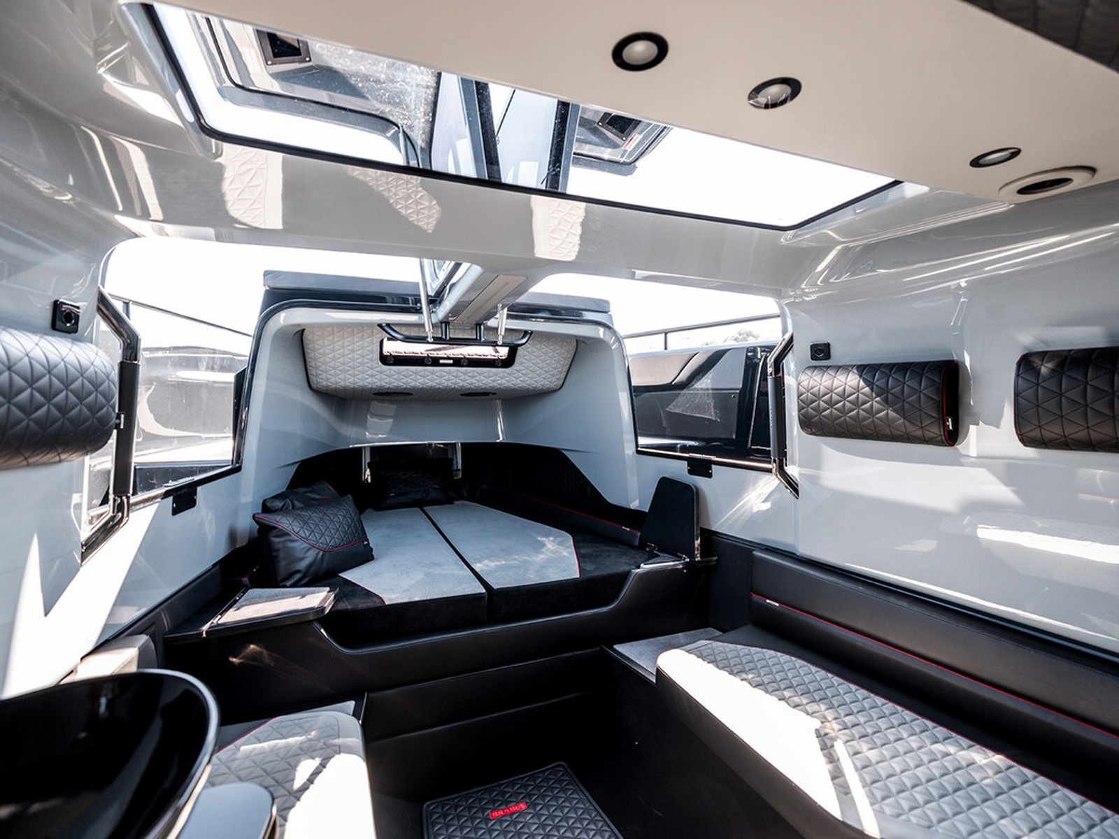 Taking it all in - Elevating the feeling of space inside, Gullwing doors for the front lounge provide easy access and interaction with the outdoors. The net result adds an influx of incoming light and makes a unique connection with the natural environment by bringing the outdoors indoors and vice-versa. Swathed in ‘sport-pattern’, cool gray and black BRABUS fine leather with contrasting red accents and stitching, the front cabin with a ‘queen size’ sleeping accommodation has every level of comfort and more for you to fully enjoy your all-weather adventures out on the water.