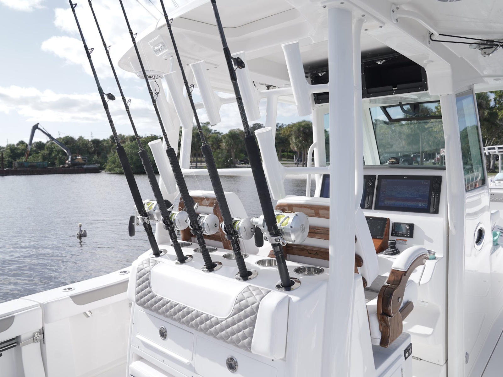 - Forward chaise lounge seating with armrests integrated into console with dry storage, 15 gal cooler, (2) large cup holders, grab handles, and (10) rod holders