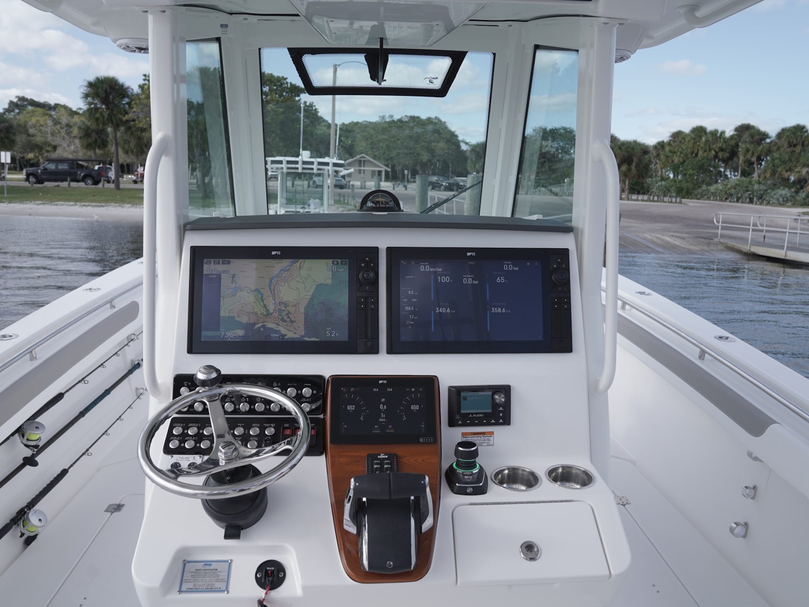 - Fiberglass hardtop with integrated powder coated aluminum supports, aft and fwd facing Lumitec® spreader lights, (8) rocket launchers, overhead electronics pod with storage, molded in radar pod and (6) overhead lights, easy access pass through hatch, (4) speaker pods, and 3-sided custom glass windshield with electrically actuated windshield vent