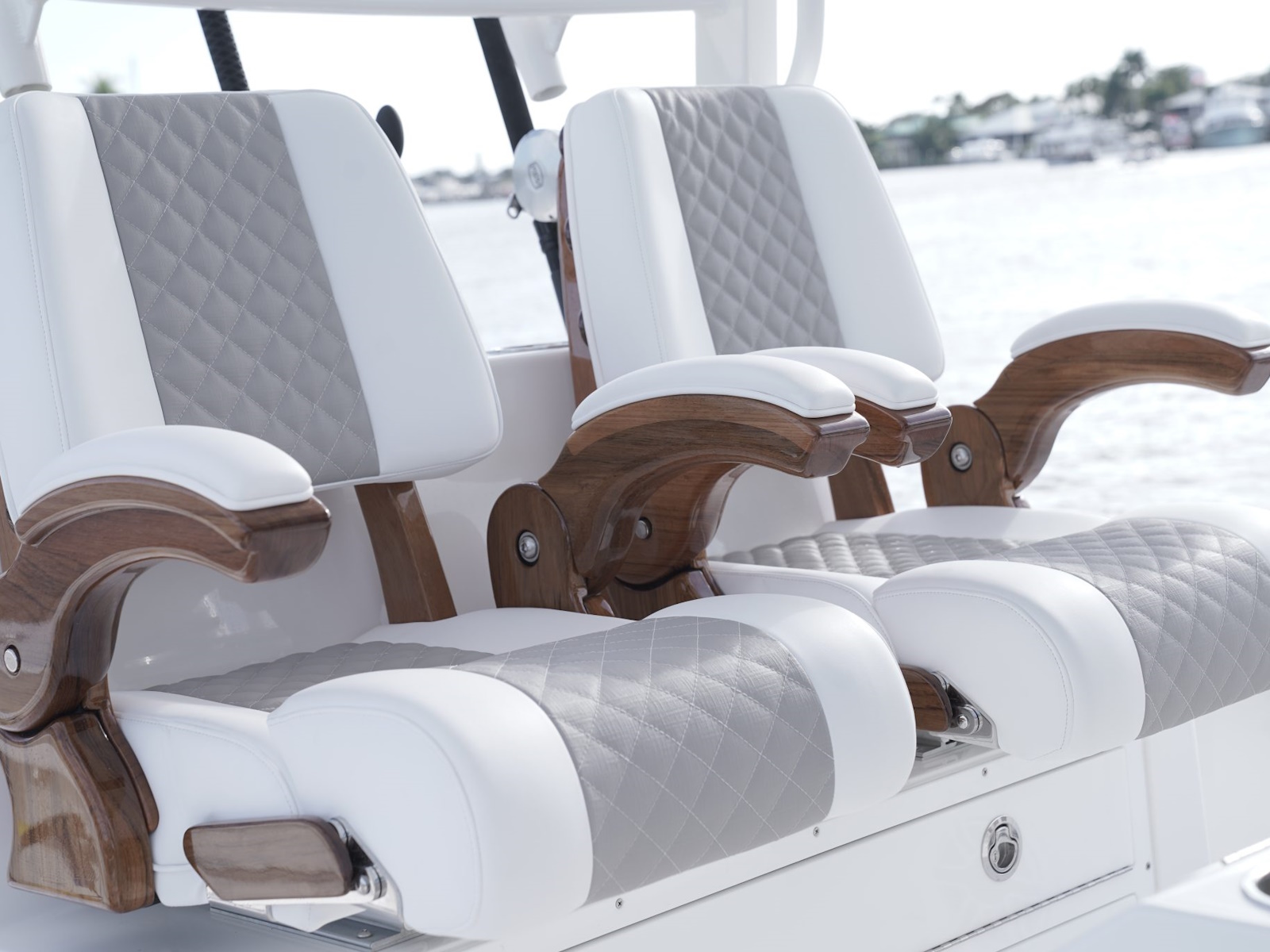 - Custom marine upholstery for console Chaise lounge, Integrated bow folding seats, coaming bolsters, and cockpit Cooler seating