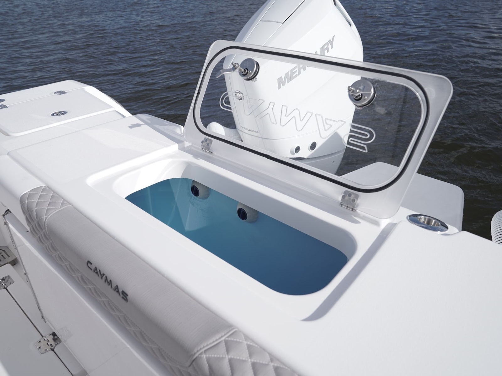 - Pressurized transom live well with custom Caymas acrylic lid, dual fill with adjustable drain and overflow, painted blue