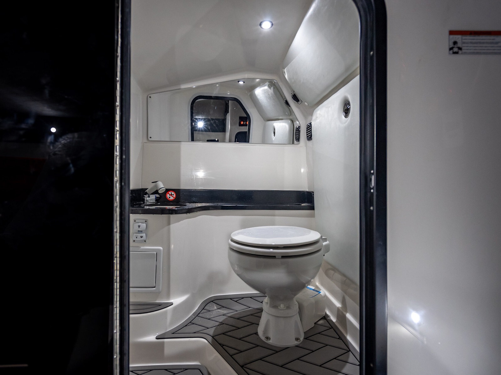 Unlike any other vessel in its class, this boat features a generously sized cabin equipped with air conditioning, two plush couches and a bed, perfect for lounging or taking a quick break. The separate bathroom adds an extra layer of convenience. With these premium amenities, the 32′ Sport Deck offers a level of luxury and practicality that’s truly unmatched in its category.