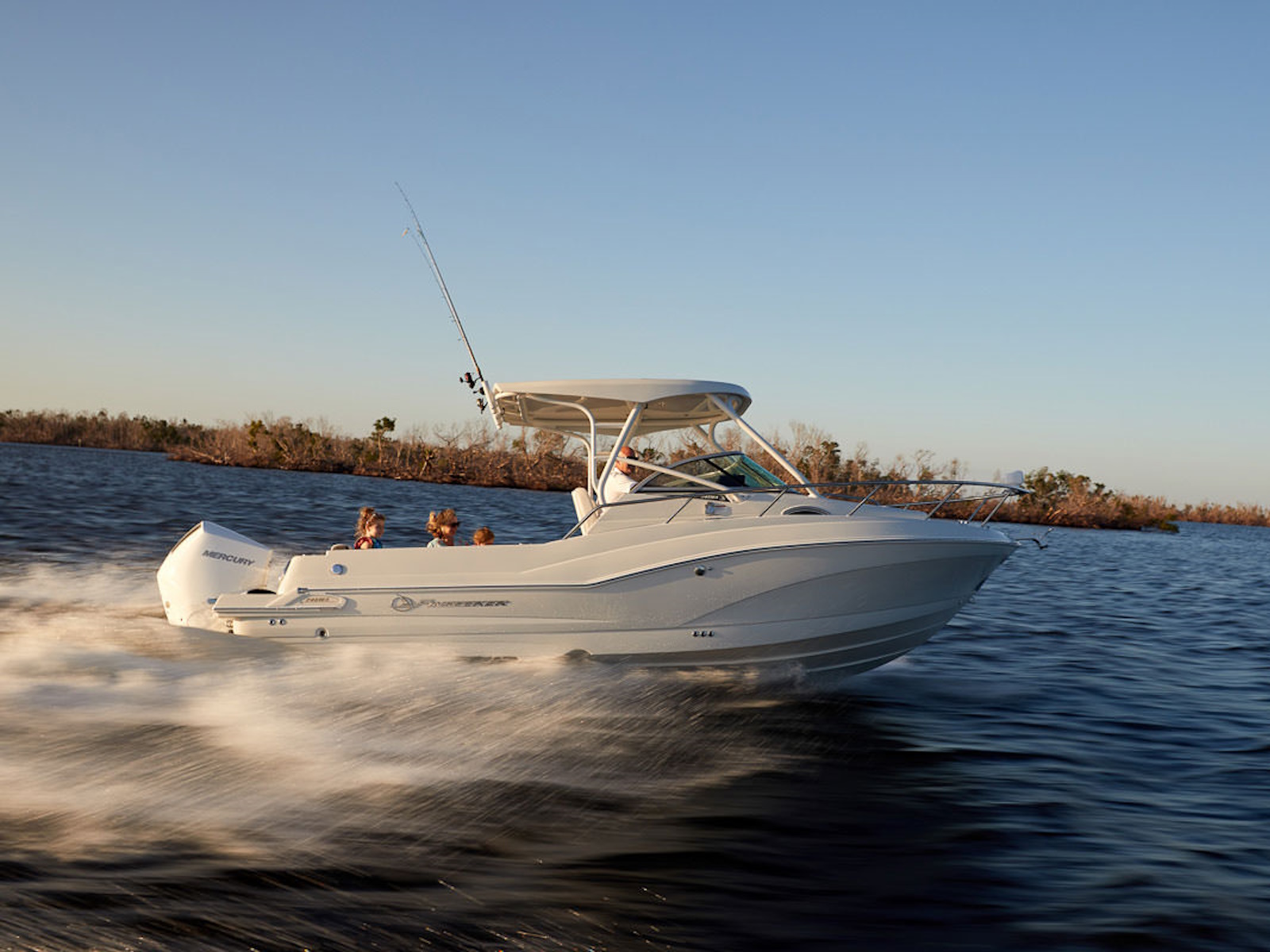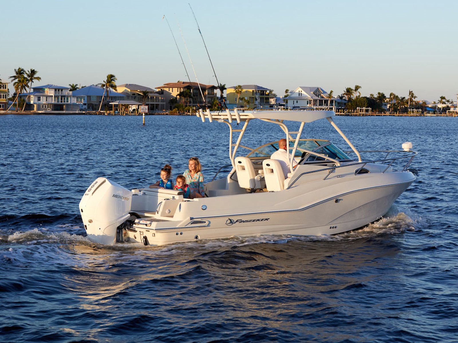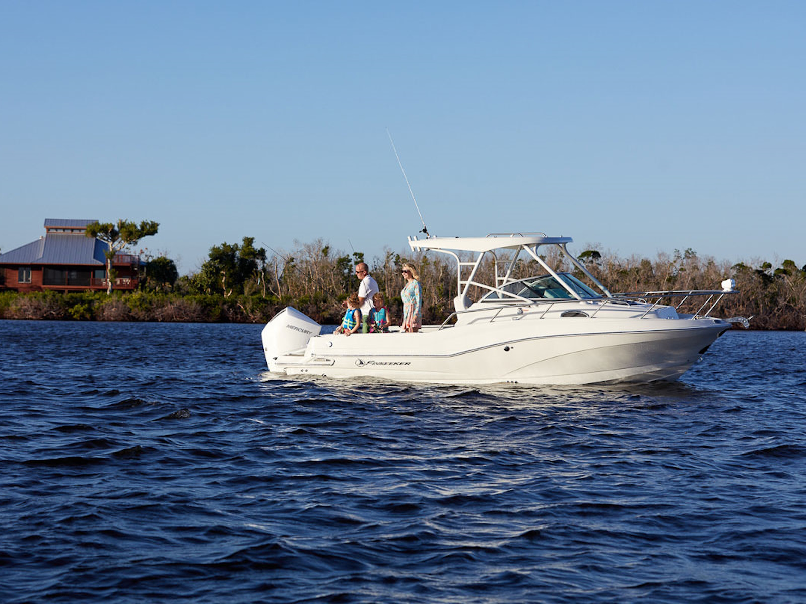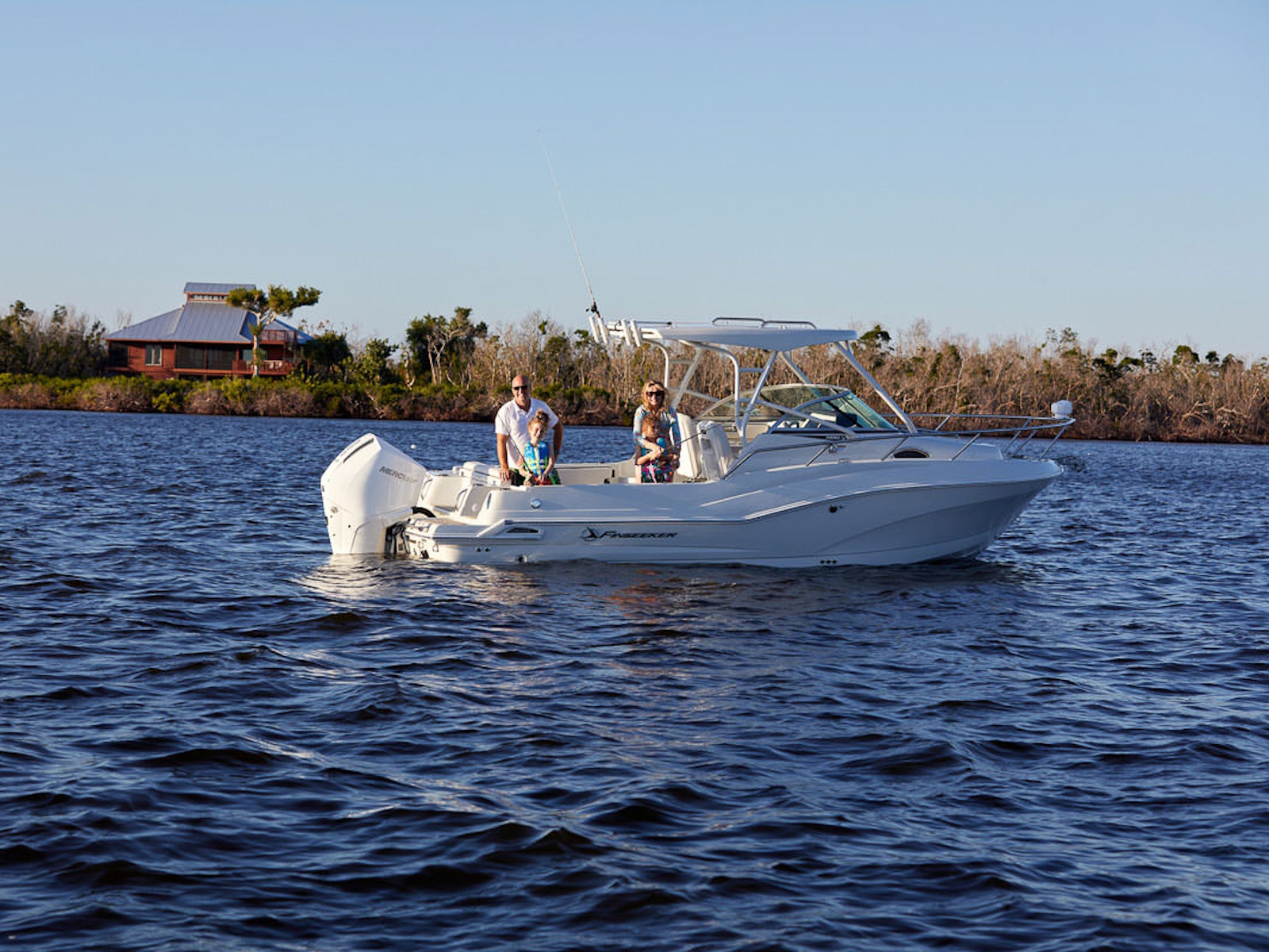 The new Finseeker by Crownline 245 WA features a 360-degree walk-around for increased fishability. A great fishing / family boat, the 245 WA is trailerable and has a small cabin area with more than 6 feet of headroom, U-shaped seating with filler cushions to form a sleeping area, a portable head, microwave, and sink. The cockpit area seats six, with flip-up features for enhanced fishing capability. The standard fiberglass hard top has rear-facing LED work lights, 4 rod holders, overhead lights and walk-around grab rails, providing protection from the elements during a full day out on the water.